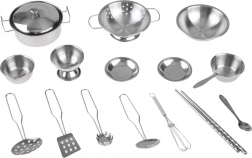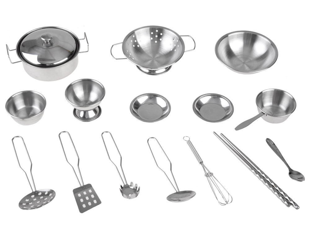 Im Set enthalten sind Seiher, Topf mit Deckel, Stielkasserolle, Schüsseln, Teller, Besteck und Kochutensilien – alles aus robustem Edelstahl.