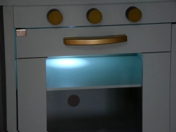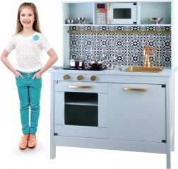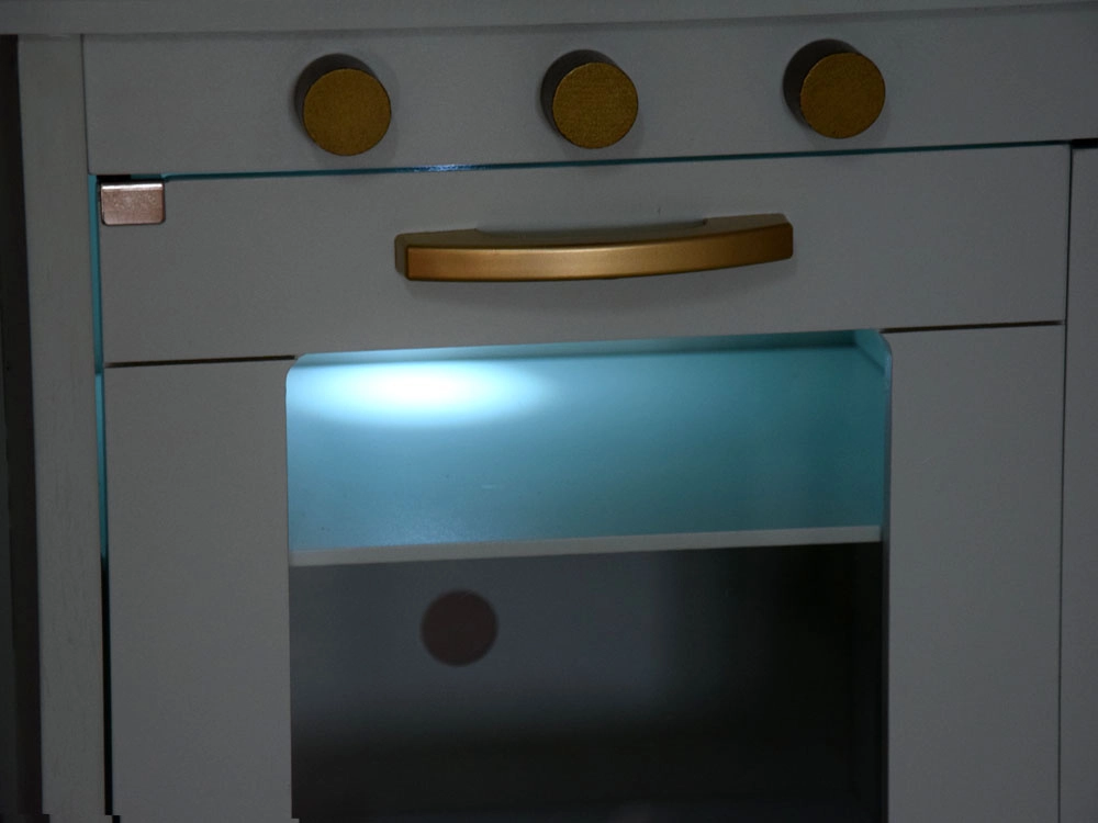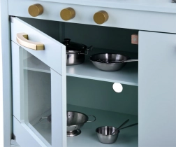 Mit dabei sind ein goldenes Spülbecken mit Vintage-Armatur, goldene Drehknöpfe und Griffe sowie eine praktische Stange zum Aufhängen von Utensilien. Das umfangreiche Set an Edelstahl-Zubehör (Topf mit Deckel, Stielkasserolle, Seiher, Schüsseln, Teller, Besteck und Kochutensilien) ermöglicht Kindern das Servieren und „Kochen“ wie in einer echten Küche.