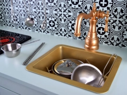 Das große goldene Spülbecken und die Retro-Wasserarmatur unterstreichen den hochwertigen Look der Küche und laden zum Abwaschen sowie zur Zubereitung von Zutaten ein.