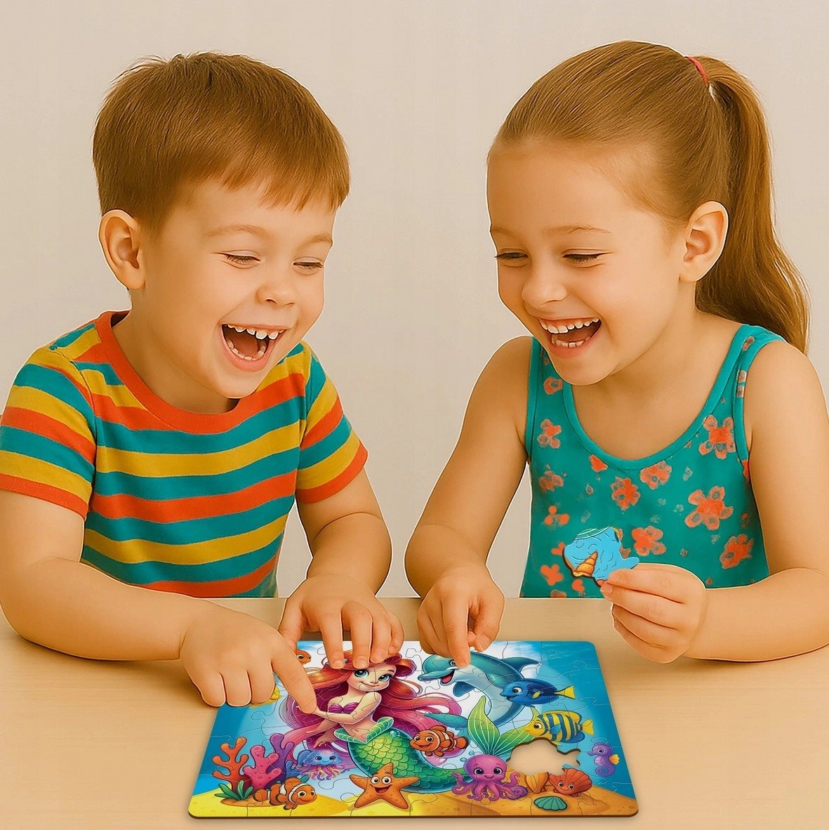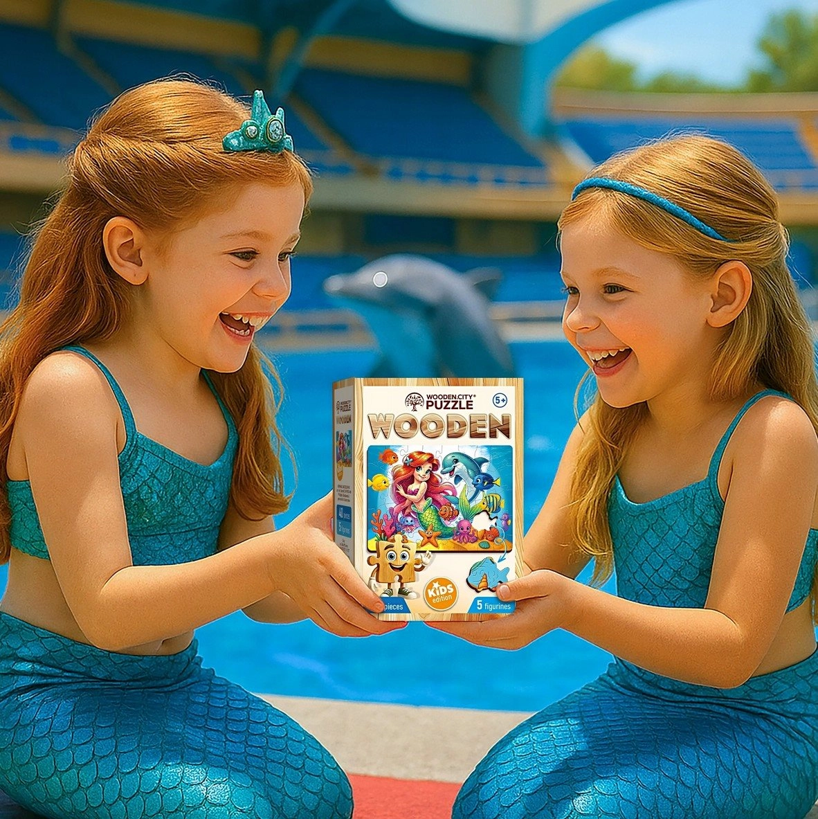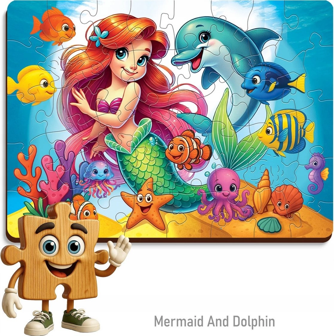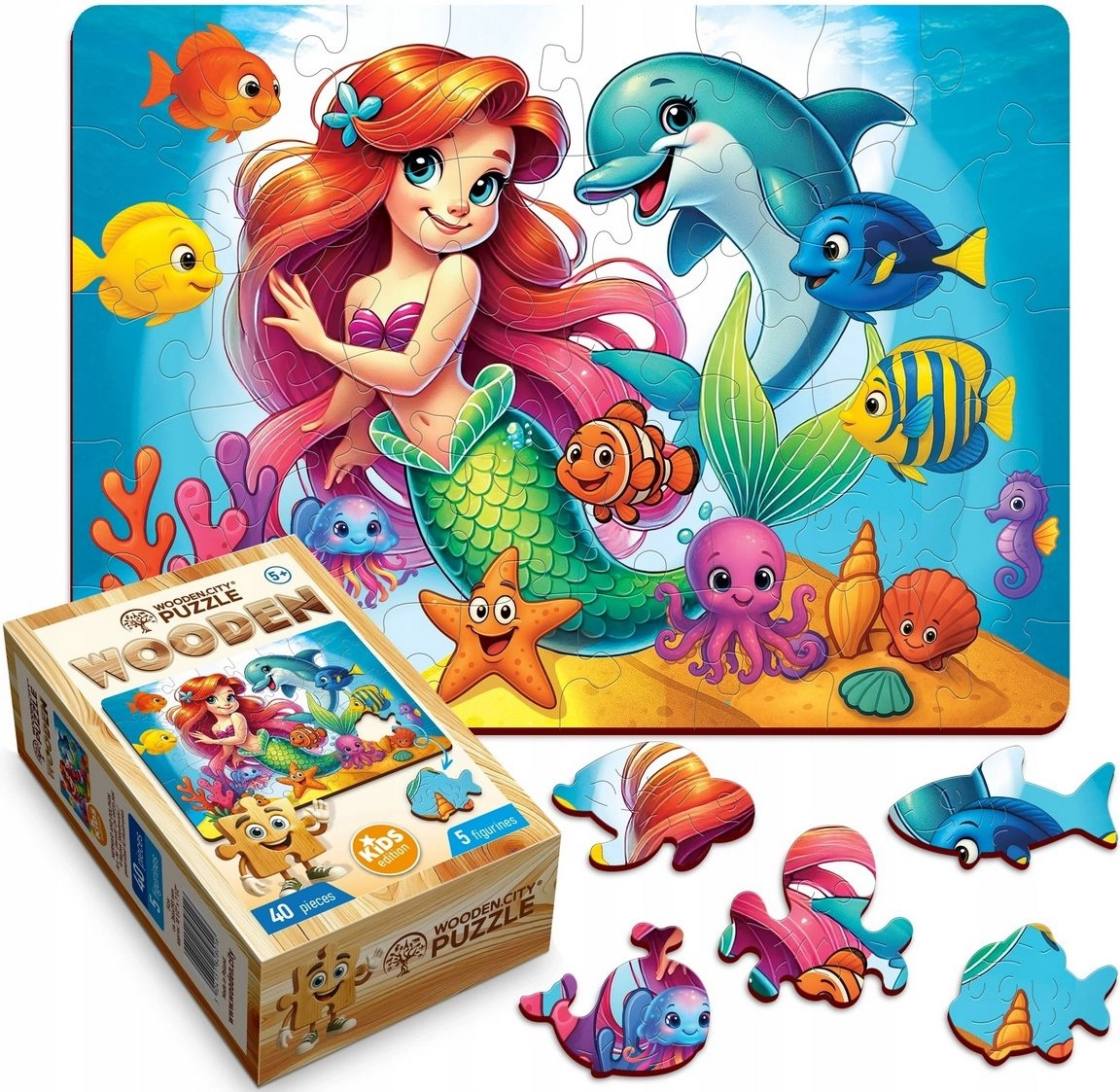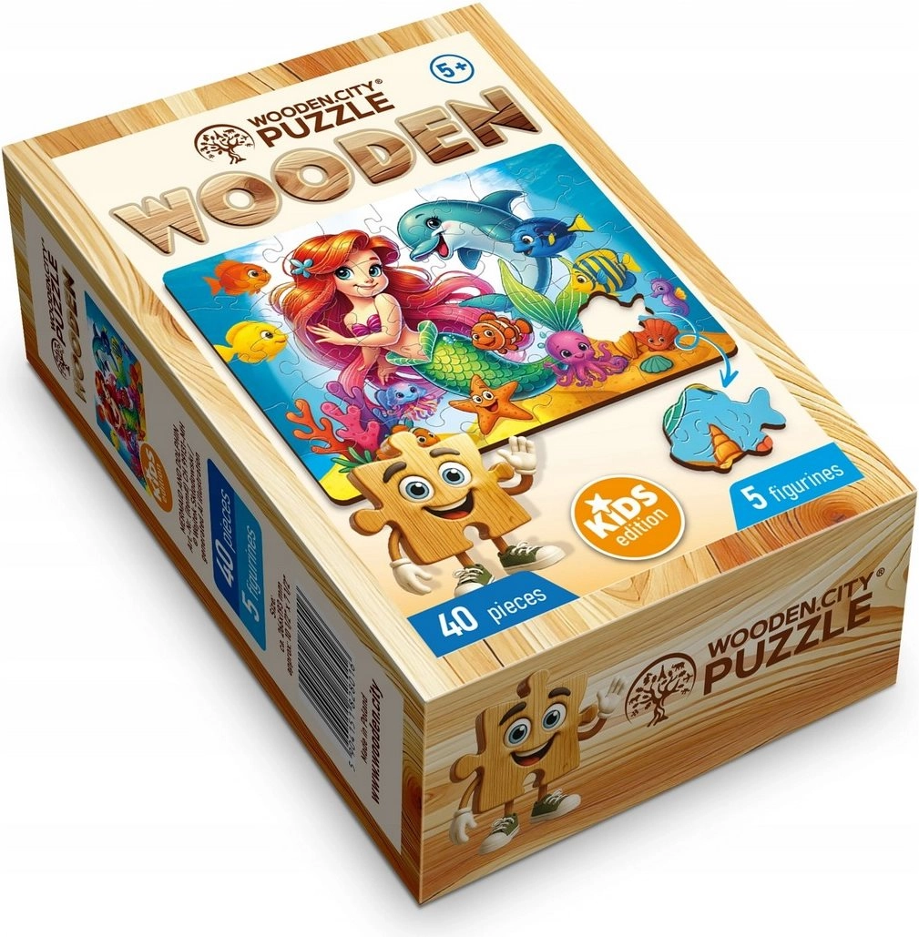 Das WOODEN CITY Holzpuzzle mit dem Motiv Meerjungfrau und Delfin bietet Kindern ein schönes visuelles Erlebnis und die Freude am fertigen Bild. Dank der hochwertigen Verarbeitung lassen sich die Teile angenehm legen und passen perfekt ineinander. Das zusammengesetzte Bild misst etwa 26,6 × 19,3 cm – ideal zum wiederholten Puzzeln oder zum Ausstellen.