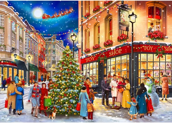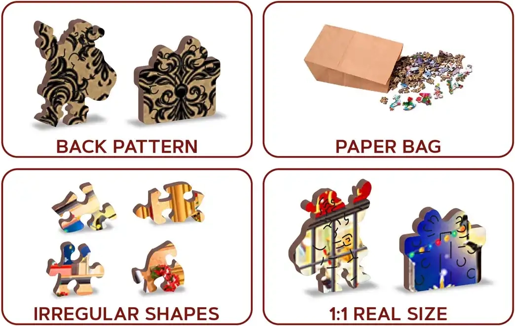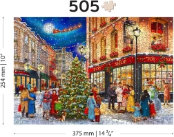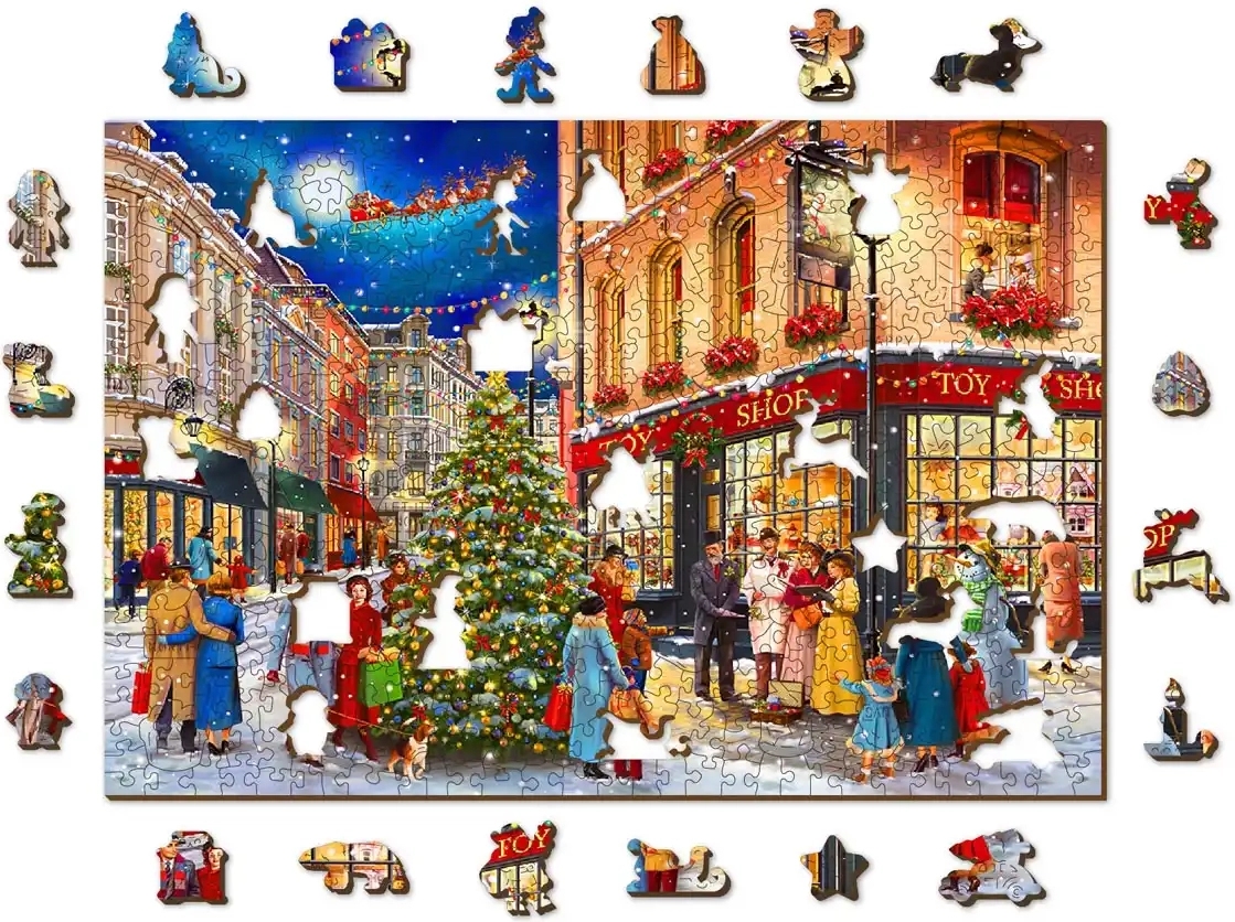 Entdecken Sie den Zauber von Weihnachten mit einem Premium-Holzpuzzle, das Puzzleliebhaber begeistert und sich außerdem als stilvolles Geschenk eignet. Das Motiv einer Weihnachtsstraße mit Tannenbaum, Sternsingern und gemütlichen Auslagen schafft eine angenehme Festtagsstimmung und ist eine tolle Aktivität für kalte Abende.