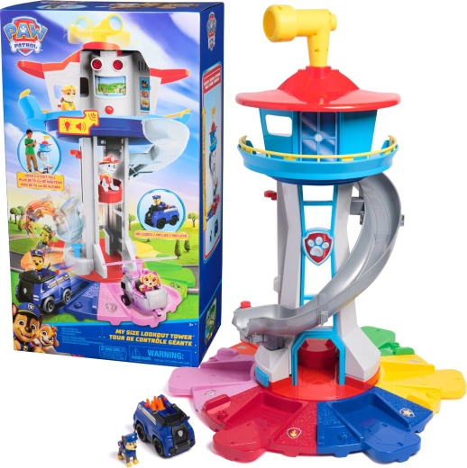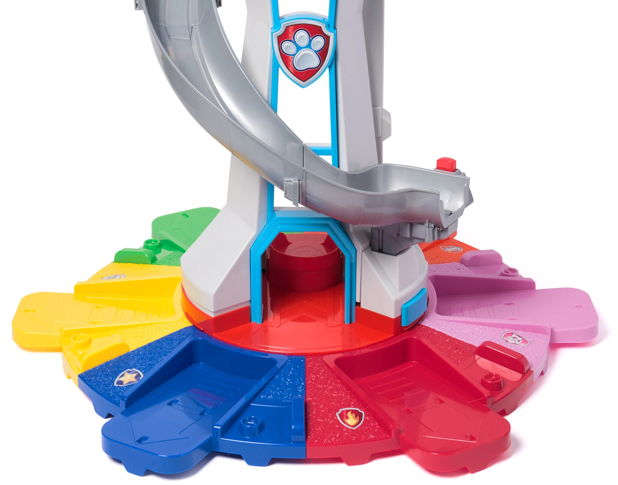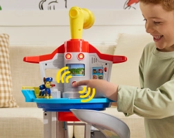 Die ikonische Basis aus PAW PATROL bietet Kindern endlose Spielmöglichkeiten. Nach der Missionswahl über das Bedienfeld mit Tasten und Effekten fährt man Chase mit dem Aufzug nach oben, schaut sich mit dem drehbaren Periskop um und startet die heldenhafte Rettungsaktion über die breite Rutsche direkt zur drehbaren Abschussrampe.