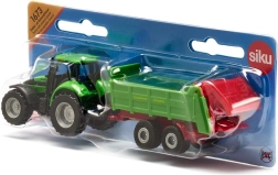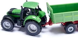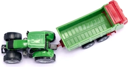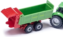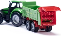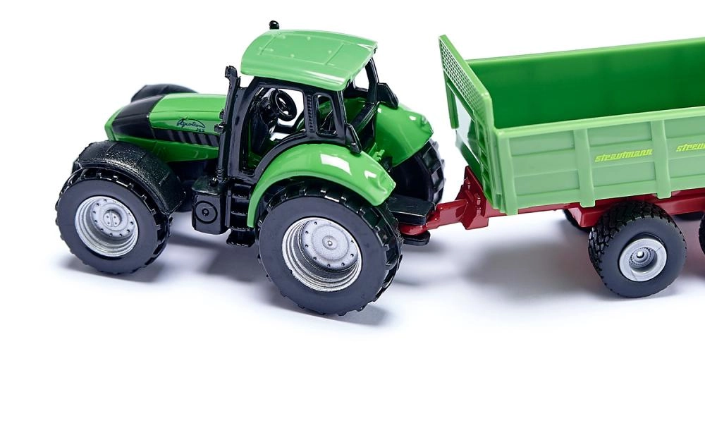 Der DEUTZ-Traktor mit STRAUTMANN-Streuer im kompakten Maßstab bietet detailreiche Ausführung, eine funktionale Deichselkupplung und leichtlaufende Räder für müheloses Fahren.