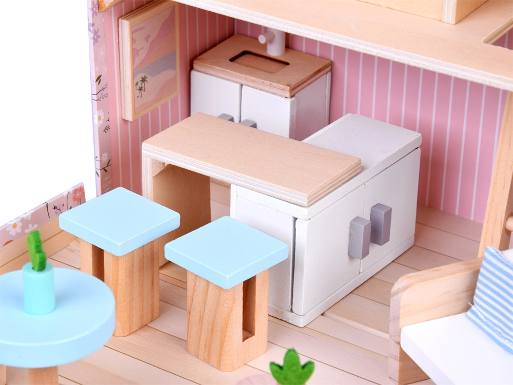 Öffnen Sie den geblümten Koffer und betreten Sie ein gemütliches zweistöckiges Puppenhaus. Oben wartet ein Schlafzimmer mit Bett und Decke, Spiegel und einem Retro-Schaukelpferd; unten ein offener Wohnbereich mit Küchenzeile – ideal für die Fünf-Uhr-Teezeit, gemeinsames Kochen und Entspannen. Alle Teile sind aus glattem Holz mit widerstandsfähiger Oberfläche gefertigt und für kleine Kinderhände designt.
