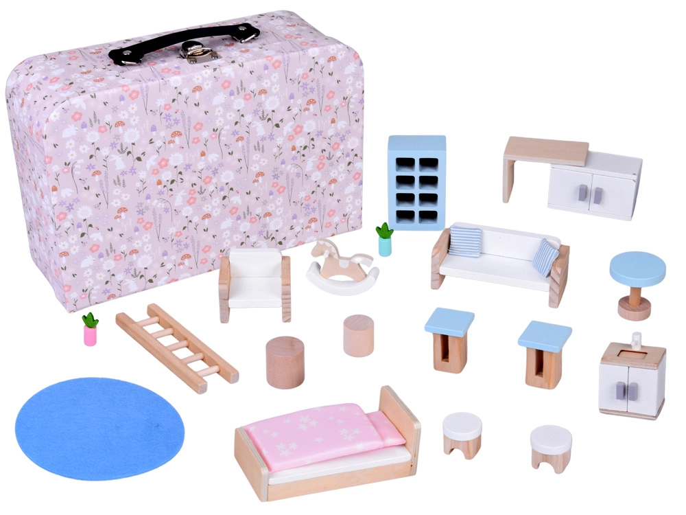 Ein niedliches zweistöckiges Puppenhaus, versteckt in einem geblümten Koffer, verbindet Spielen und praktisches Aufbewahren. Der aufklappbare Koffer dient als Spielhaus und zugleich als Aufbewahrungsbox. Enthalten ist viel Holzmobiliar in zarten Pastellfarben – Bett mit Decke, Sofa, Sessel, Tisch, Beistelltische, Schränkchen, Regale, Stühlchen, Teppich sowie ein Steckenpferd. Dank des Griffs ist das Set leicht zu tragen, kompakt und ideal für kreatives Spiel und die Entwicklung der Fantasie zu Hause und unterwegs.