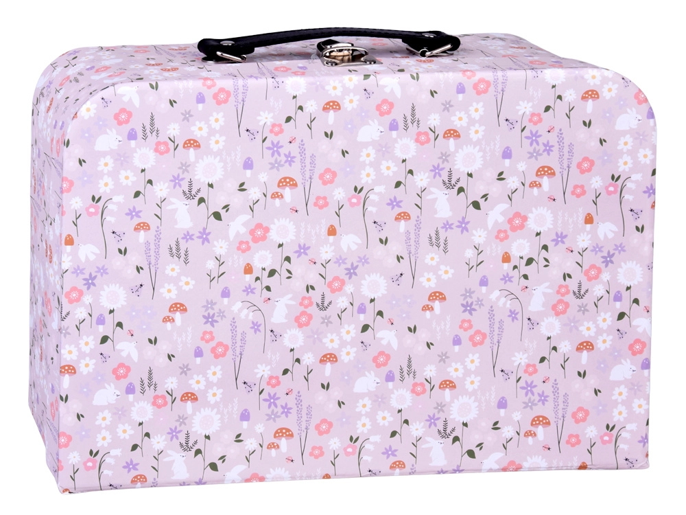 Der kompakte Koffer mit Blumenprint wird nach dem Öffnen zu einem zweistöckigen Puppenhaus. Er dient als Spielzeug und praktischer Stauraum zugleich – alles bleibt beisammen und ist reisefertig.