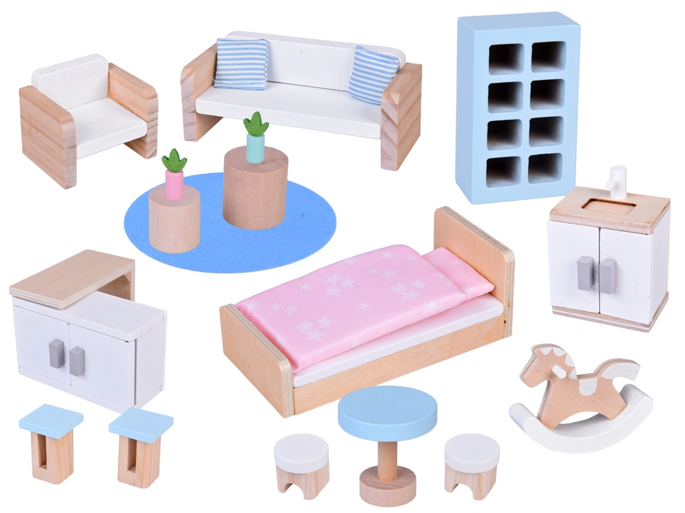 Bett mit Decke, Sofa, Sessel, Tische, Stühlchen, Küchenzeile, Schränkchen, Regale, Leiter, Teppich, Steckenpferd und Pflänzchen – alles in zarten Pastellfarben zum kreativen Arrangieren.