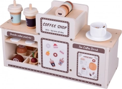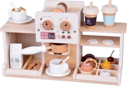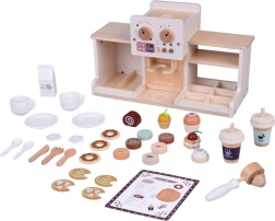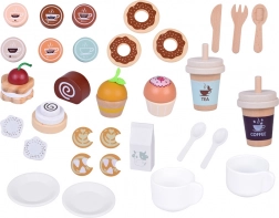 Umfangreiches Zubehör umfasst Tassen mit Untertassen und Löffeln, To-go-Becher mit Deckeln (Tea, Coffee), einen Milchkarton, Besteck, verschiedene Törtchen, Muffins, Kekse und Schokolädchen sowie eine einfache Speisekarte. Alles ist perfekt für kleine Hände geeignet und unterstützt die Feinmotorik, Hand-Auge-Koordination und soziale Fähigkeiten.