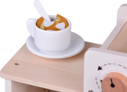 Drehknöpfe, Icon-Drucke und die Brühgruppe sorgen für echtes Kaffeezubereitungs-Feeling. Kinder können Holzkapseln einlegen und das ideale Getränk „einstellen“.