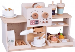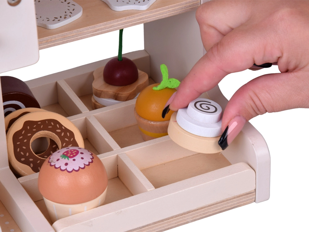 Entdecken Sie die Magie der Barista-Welt mit dem Holz-Café, das aussieht und funktioniert wie ein echtes. Kinder können die Stärke des Kaffees mit drehbaren Knöpfen „einstellen“, die Brühgruppe/den Portafilter einsetzen, Kapseln für Kaffee oder Tee auswählen, „Milch“ aufschäumen und Desserts auf Tellern servieren. Die robuste Holzkonstruktion mit sicheren Farben und einer sanften Pastellpalette sorgt für Langlebigkeit und eine schöne Optik im Kinderzimmer.