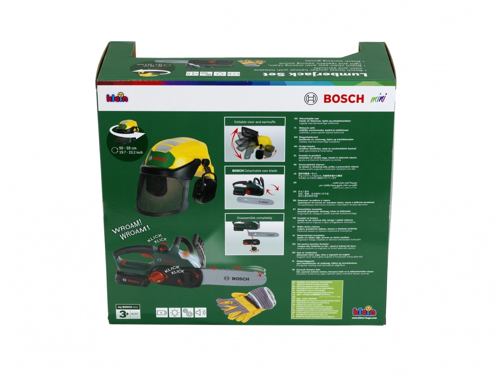 Das BOSCH Holzfäller-Kinderset wurde für sicheres und anregendes Spielen entwickelt. Die elektronische Motorsäge gibt mit aufgesetzter Schiene authentische Sägetöne von sich und verfügt über ein begleitendes blinkendes Licht, das die Arbeit eines echten Werkzeugs simuliert. Der verstellbare Helm mit Visier und integrierten „Kopfhörern“ erhöht die Realitätsnähe und vermittelt grundlegende Sicherheitsregeln.