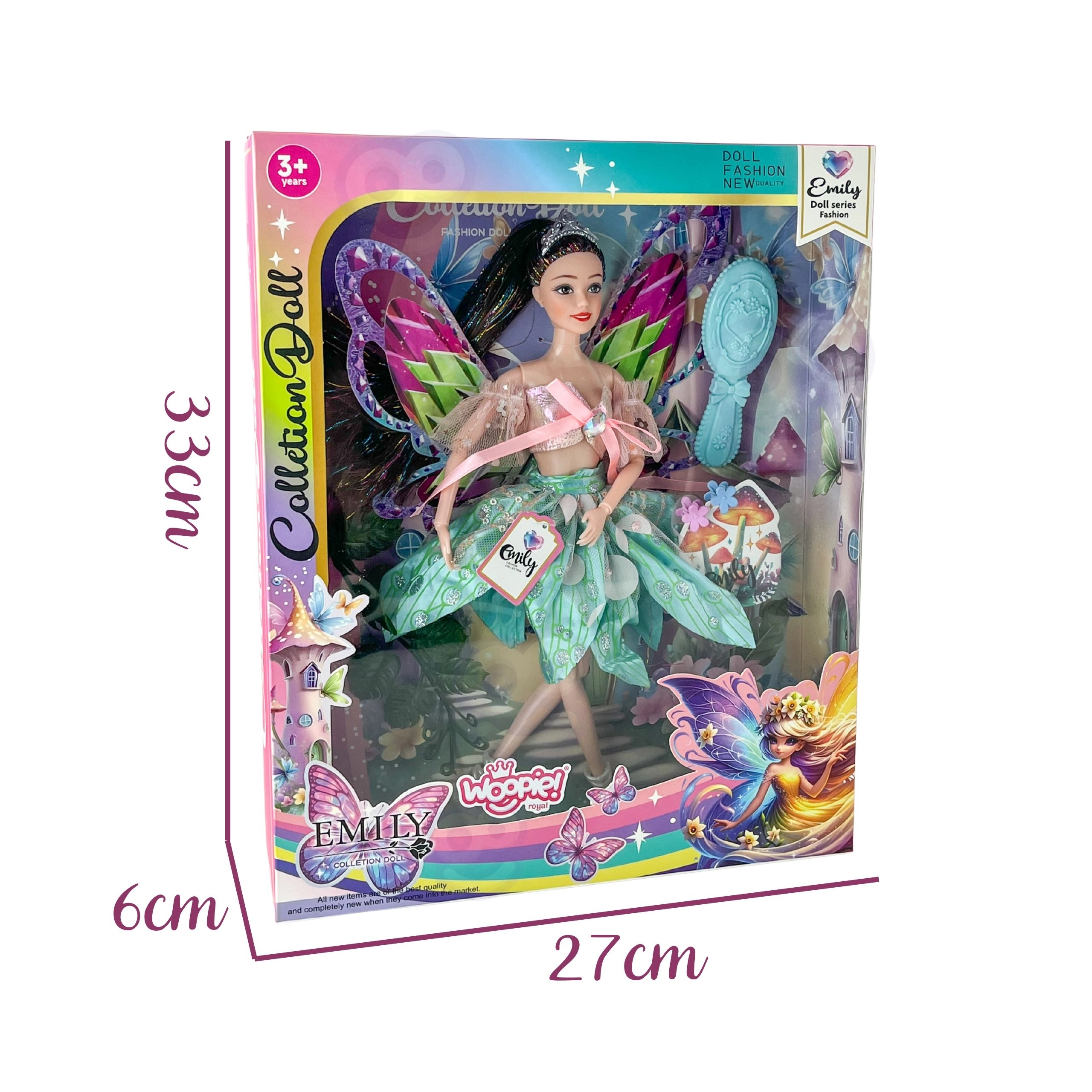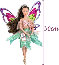 Dank der beweglichen Arme und Beine lässt sich die Puppe leicht in verschiedene Positionen bringen – vom Feentanz bis zum Posieren. Im Set ist außerdem eine Haarbürste zum Kämmen der langen Strähnen mit glänzenden Fasern enthalten, sodass Kinder Styling und Pflege genießen können.