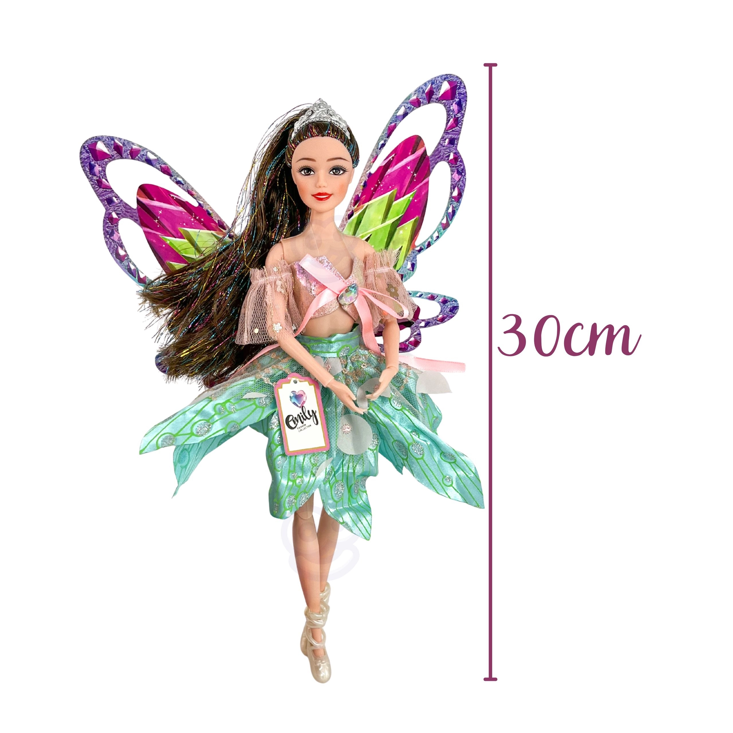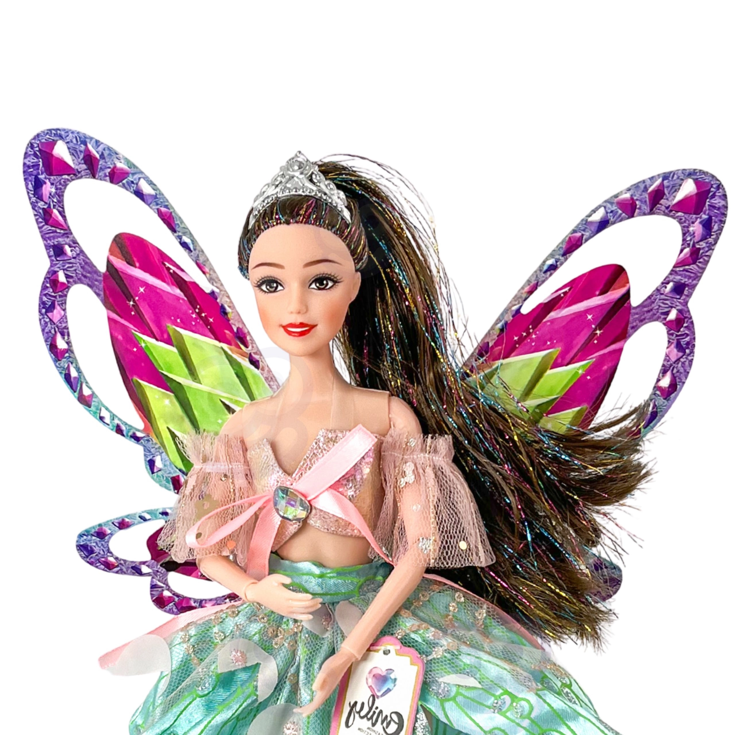 Puppe Emily ist wie geschaffen für kleine Träumer, die Märchen, Mode und magische Abenteuer lieben. Ihre großen bunten Flügel und glitzernden Details erzeugen den Effekt einer echten Fee, während das elegante Kleid mit Tüllärmeln festlich und fotogen wirkt.
