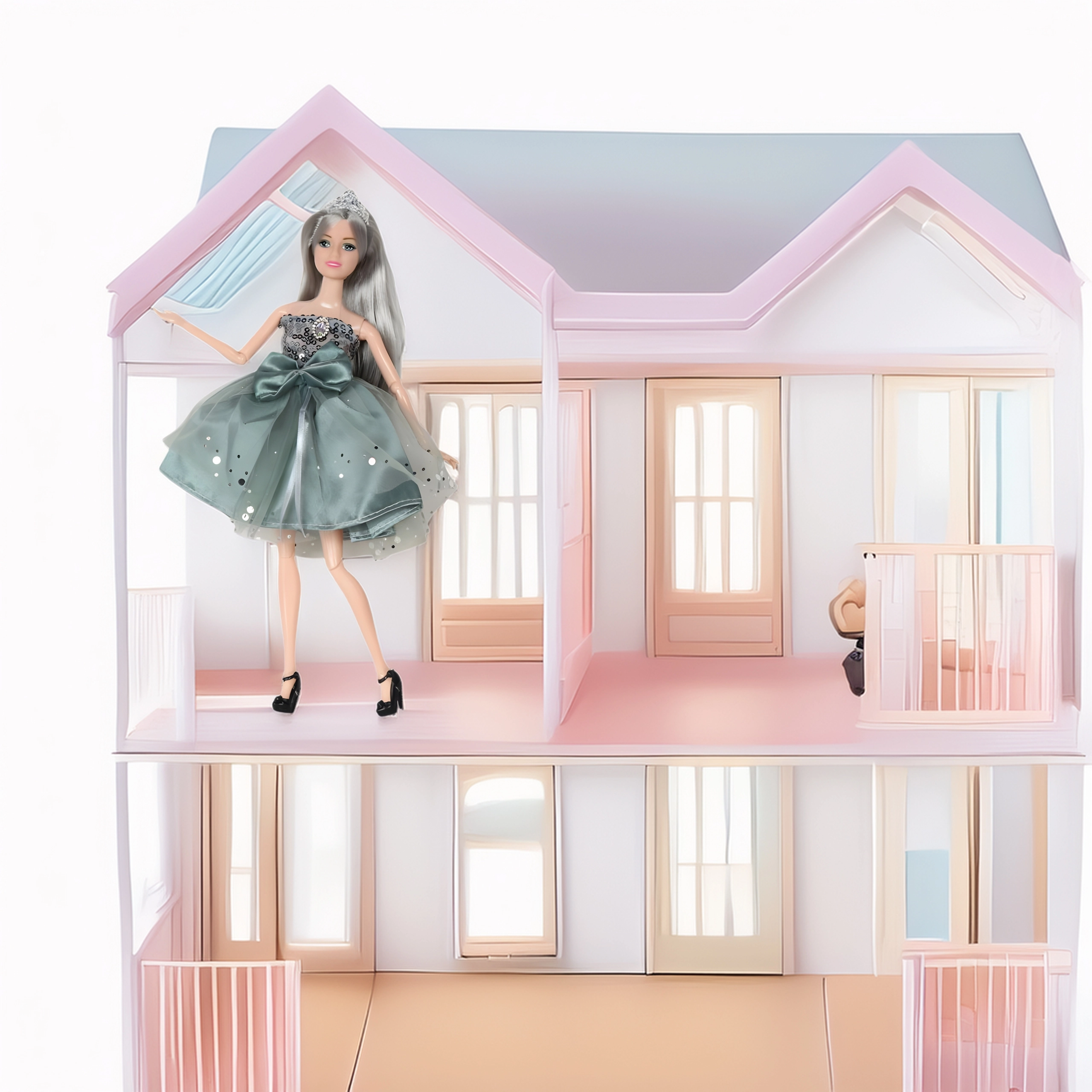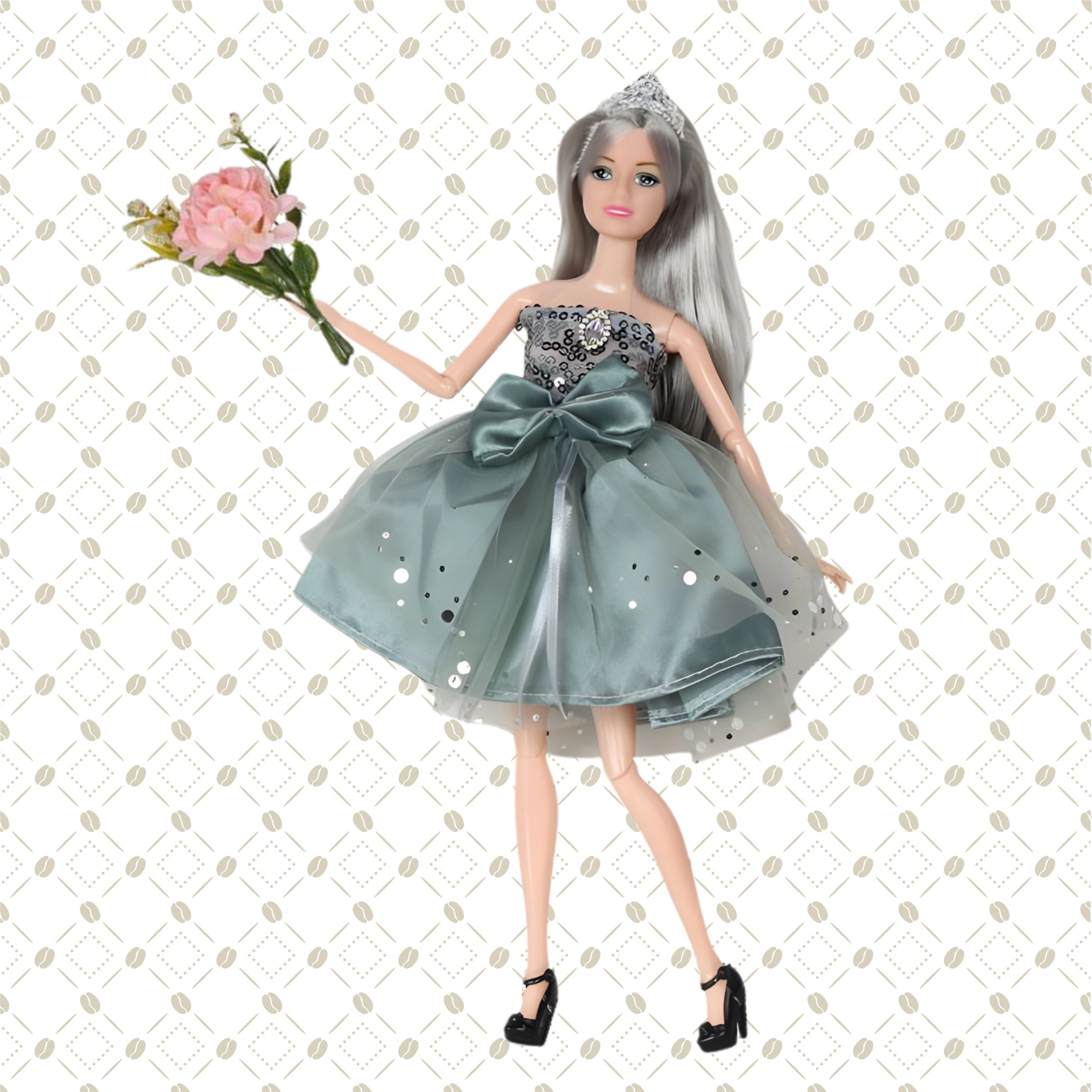 Puppe Emi ist für Kinder gemacht, die Modeaccessoires und fantasievolle Geschichten lieben. Das elegante grüne Kleid mit zartem Tüll-Overlay und auffälliger Schleife macht jedes Spiel zu einem noblen Ereignis. Die langen violett-silbernen Haare lassen sich kämmen und in verschiedene Styles frisieren, während die Krone und weitere Accessoires jedem Outfit einen königlichen Touch verleihen.