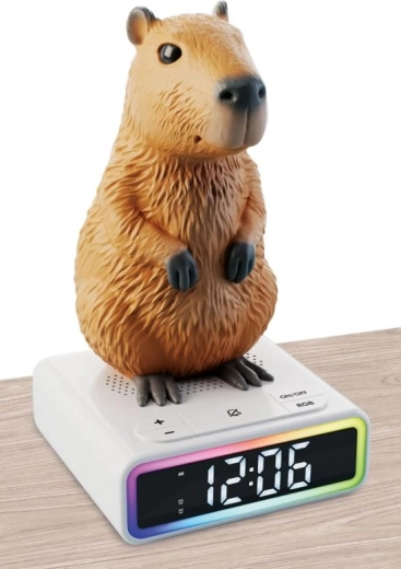 Machen Sie das Aufwachen zum Vergnügen. Dieser stylische Wecker mit Capybara-Motiv bietet eine farbige LED-Hintergrundbeleuchtung, die sich nach und nach ändert, sowie eine große Auswahl an Melodien, damit jeder Morgen angenehmer wird. Dank des übersichtlichen Displays sehen Sie schnell die Uhrzeit und die Alarmeinstellungen.