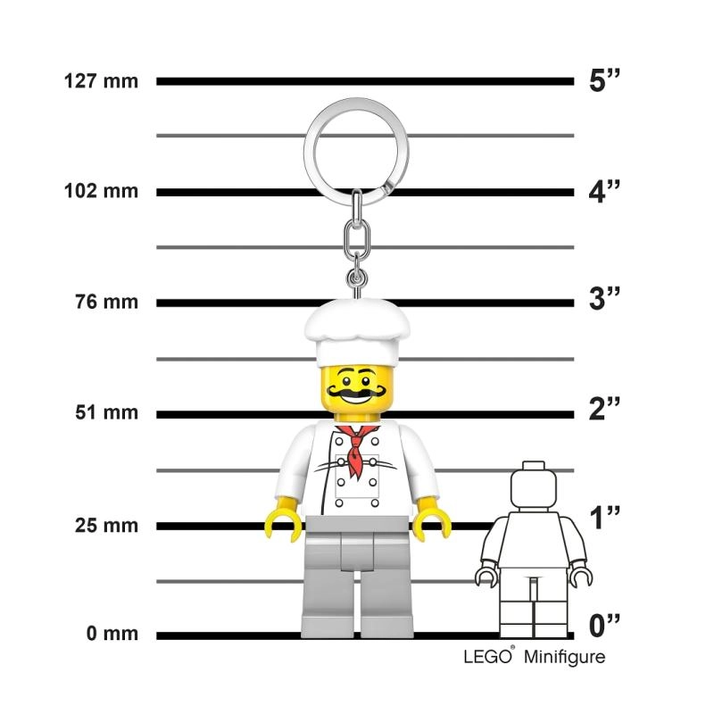 Die beliebte Minifigur in der Chefkoch-Version verwandelt Ihren Schlüsselbund in ein stylisches Accessoire, das gleichzeitig im Dunkeln hilft. Einfach die Taste drücken und das helle weiße LED-Licht leuchtet das Schloss oder den Rucksack aus.