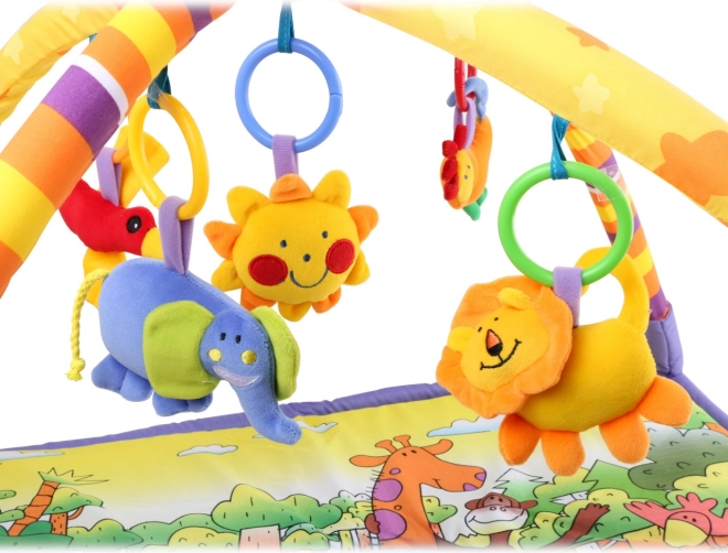 Machen Sie Ihrem Baby eine Freude mit einer weichen und sicheren Spieldecke mit Spielbogen im Dschungelmotiv. Sie bietet eine farbenfrohe Ausführung, 5 abnehmbare Plüschspielzeuge und Soundeffekte zur Förderung der Sinne und der Motorik. Lässt sich leicht zusammenklappen und in einer praktischen Tasche transportieren.