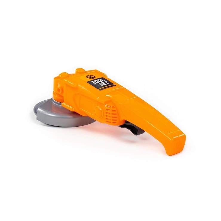Orangefarbenes Gehäuse, graue Abdeckung und Scheibe imitieren einen echten Winkelschleifer, sodass sich Kinder wie richtige Handwerker fühlen.