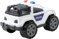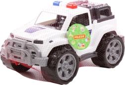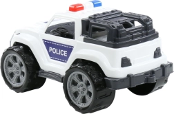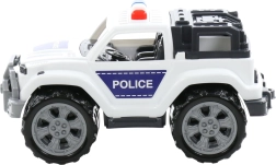 Weiße Karosserie mit der Aufschrift POLICE, Lichtbalken und Schutzstoßfängern unterstützt realistisches und kreatives Spiel.