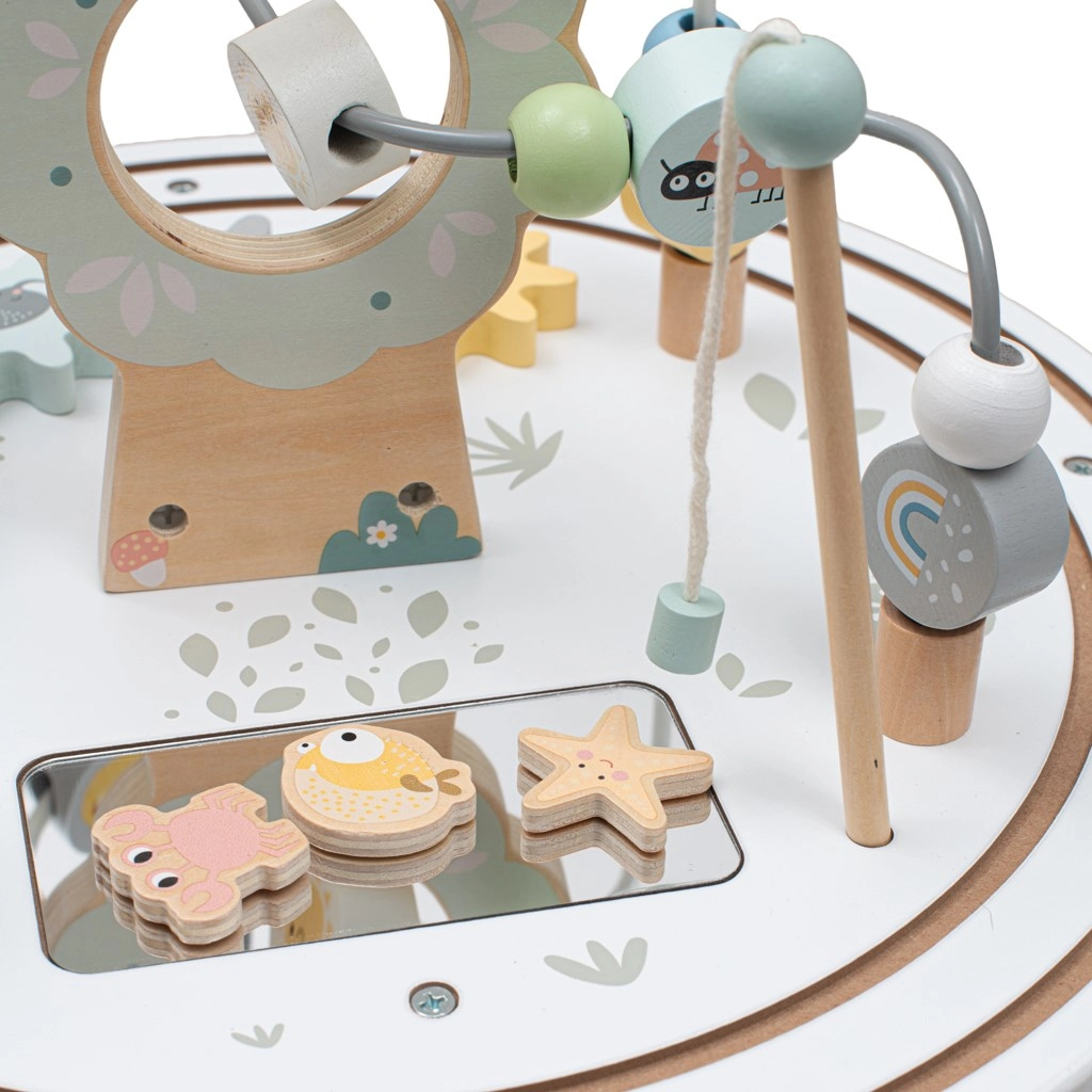Der Tisch bietet eine vielfältige Auswahl an Aktivitäten, die Kinder über lange Zeit beschäftigen und gleichzeitig ihre Fähigkeiten fördern: