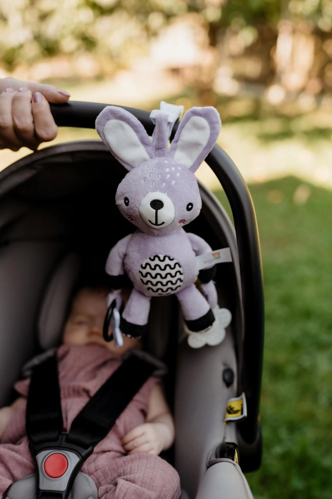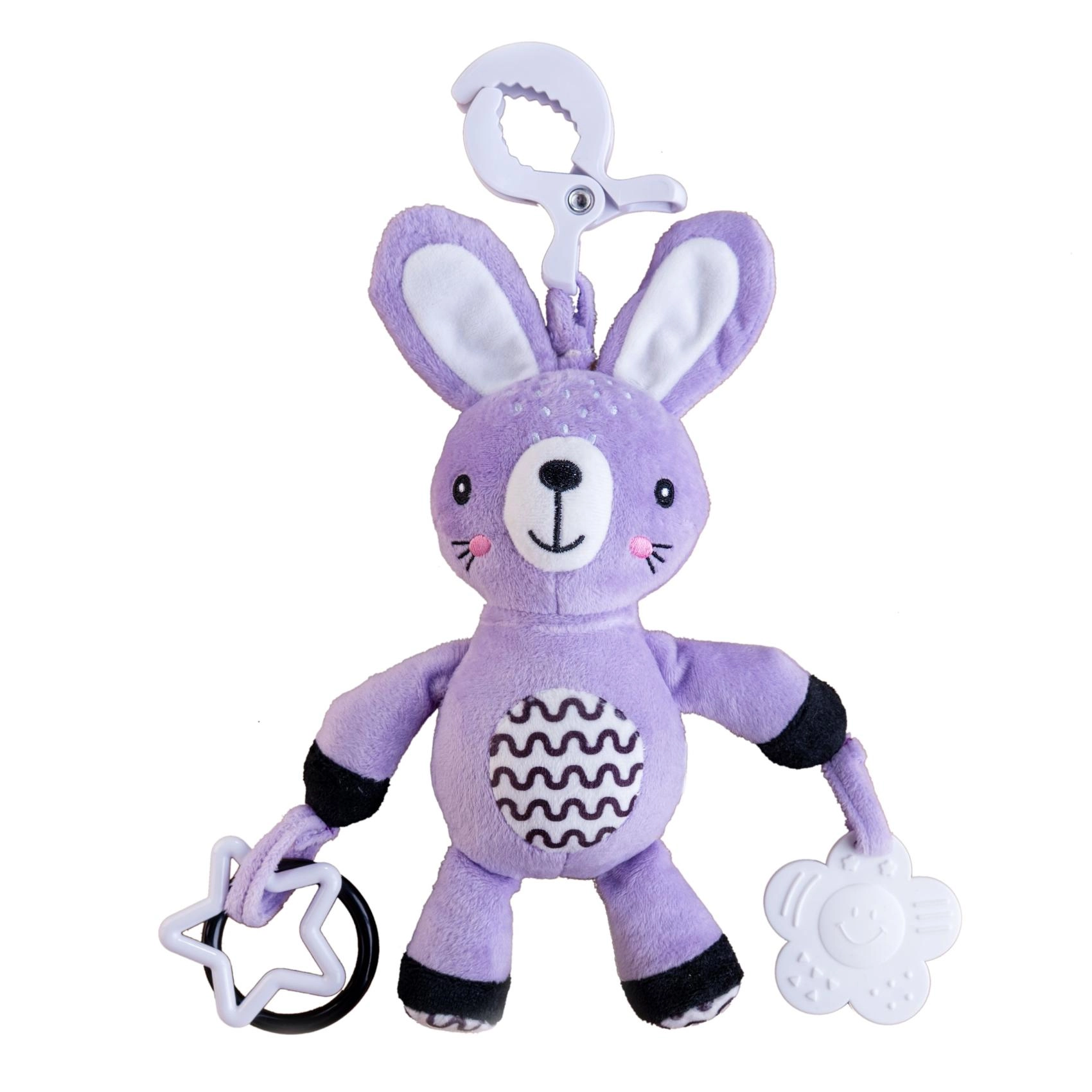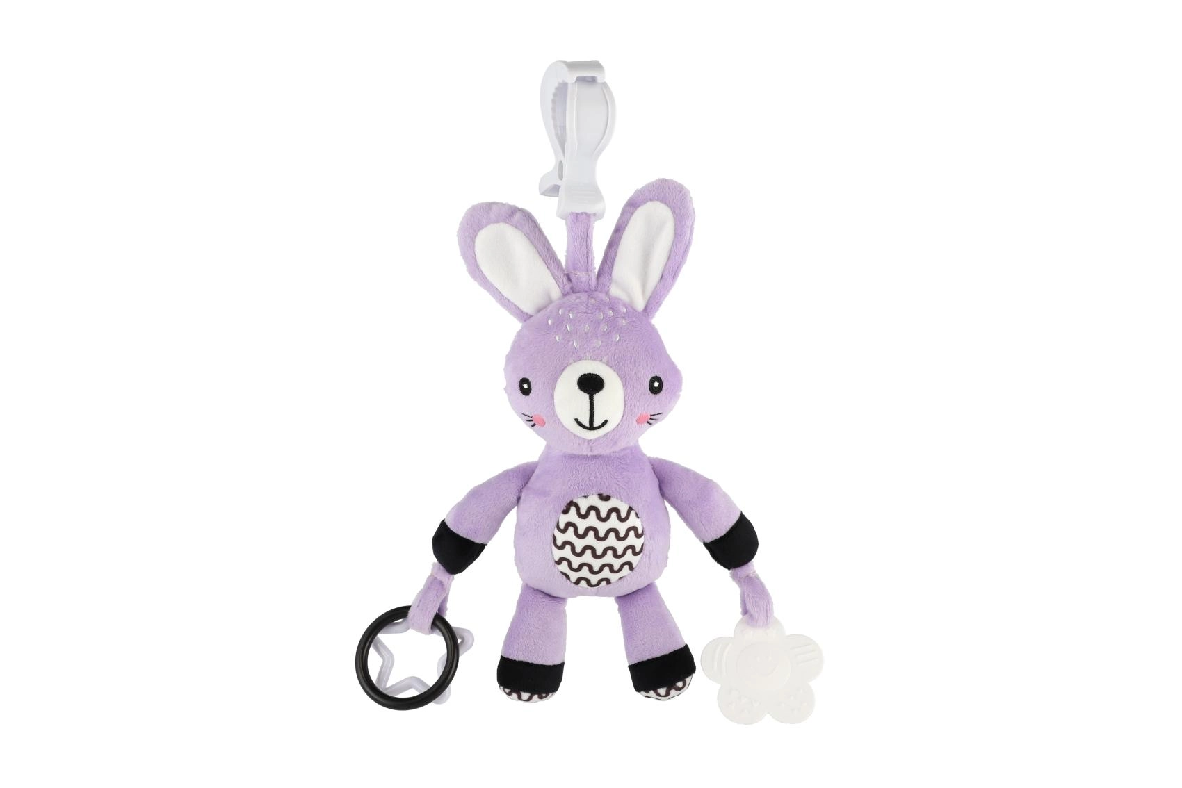 Praktischer Clip zur schnellen Befestigung am Kinderwagen, Autositz, Bettchen oder Spielbogen – Unterhaltung und Beruhigung jederzeit griffbereit.