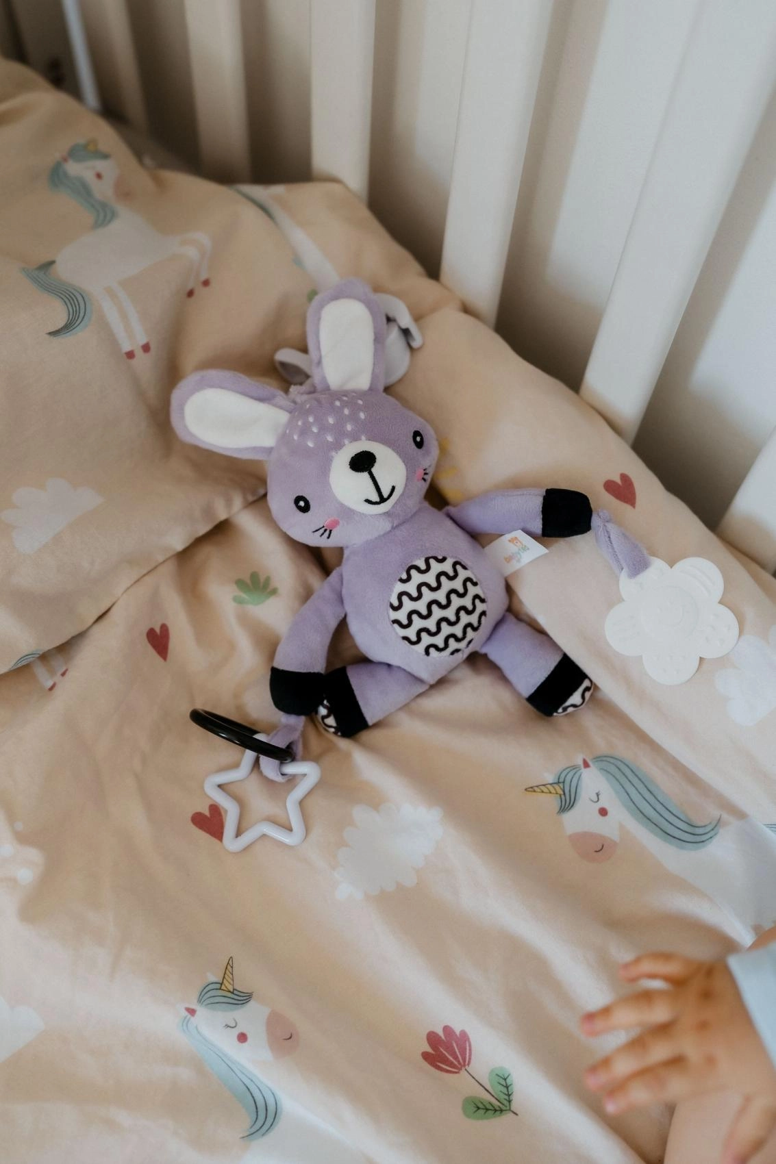 An den Pfotenenden finden Sie sichere Kunststoffformen – einen Stern und eine Blume. Diese dienen als Beißringe und helfen, den Griff sowie die Handkoordination zu trainieren. Das Spielzeug ist in der Tschechischen Republik zertifiziert und für Kinder ab der Geburt geeignet.