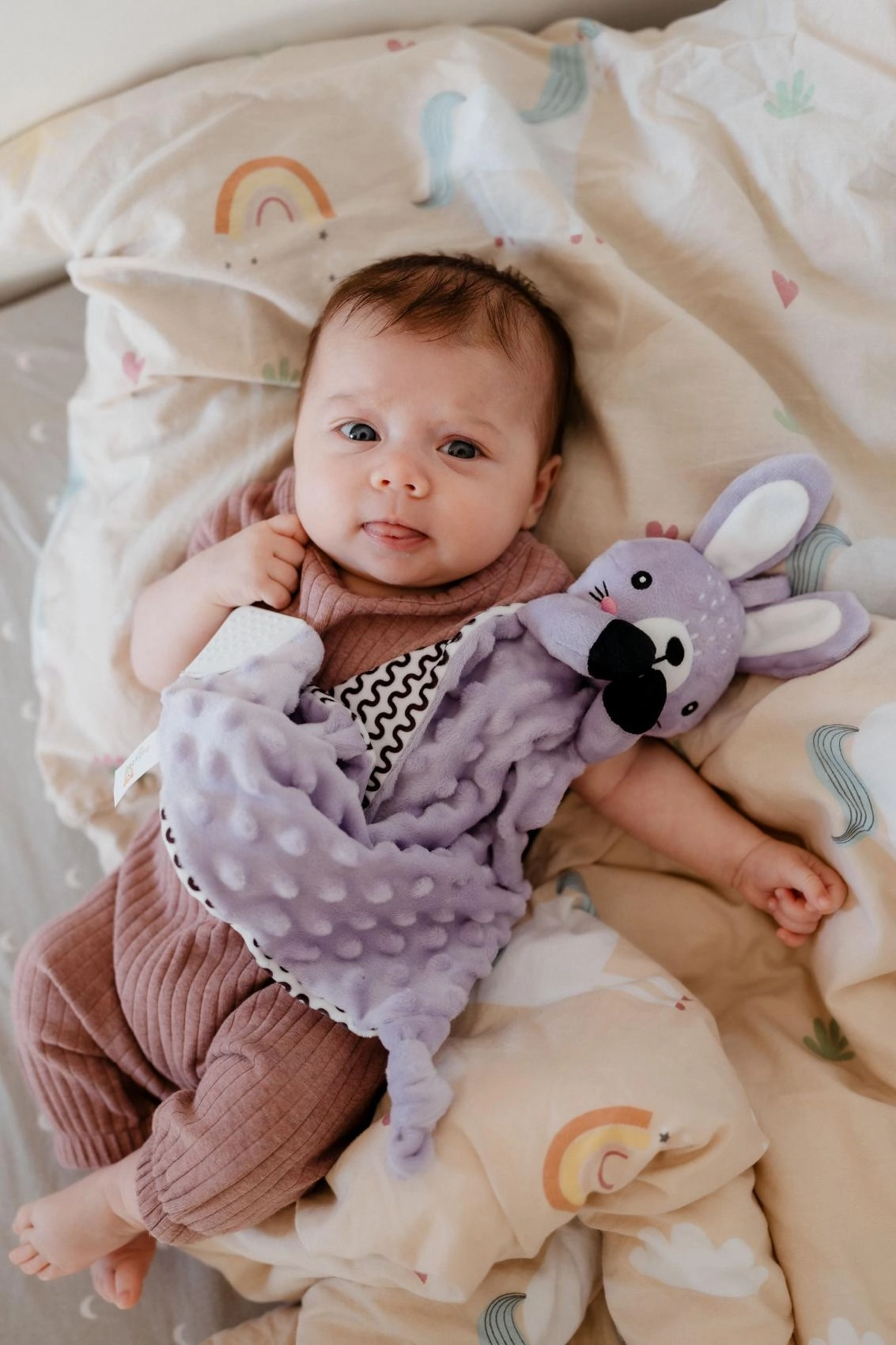 Dieses weiche Plüsch-Schlafhäschen ist der ideale erste Begleiter für Babys. Das Minky-Material mit geprägten 3D-Punkten bietet angenehme taktile Stimulation, beruhigt und schafft ein Gefühl der Sicherheit, tagsüber wie auch beim Schlafen. Dank des leichten Designs können es selbst kleine Kinderhände gut greifen.