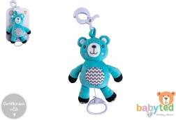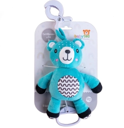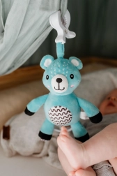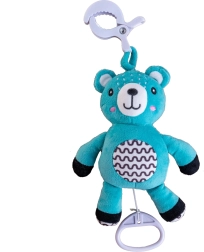 Dieser hängende Plüschbär ist für ruhiges Einschlafen und Unterhaltung unterwegs konzipiert. Durch Ziehen an der Schlaufe startet eine melodische Wiegenmelodie, die Ihr Baby beruhigt. Dank des praktischen Clips lässt sich das Spielzeug leicht am Babybett, Kinderwagen, Autositz oder an einem Spielbogen befestigen.