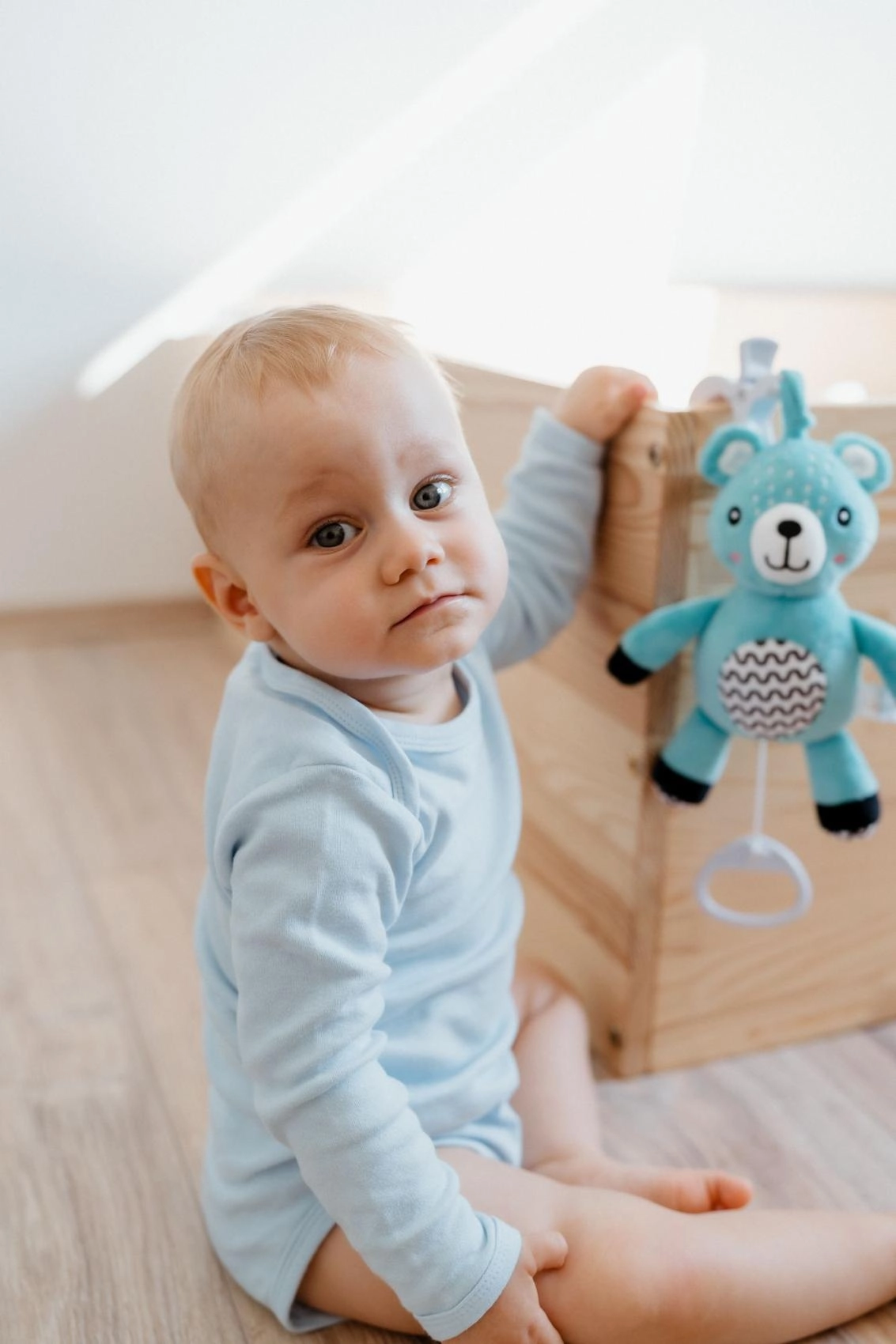 Ziehen Sie an der Schlaufe und der Bär spielt eine sanfte Melodie, die Ihrem Baby beim Einschlafen hilft und es beruhigt.