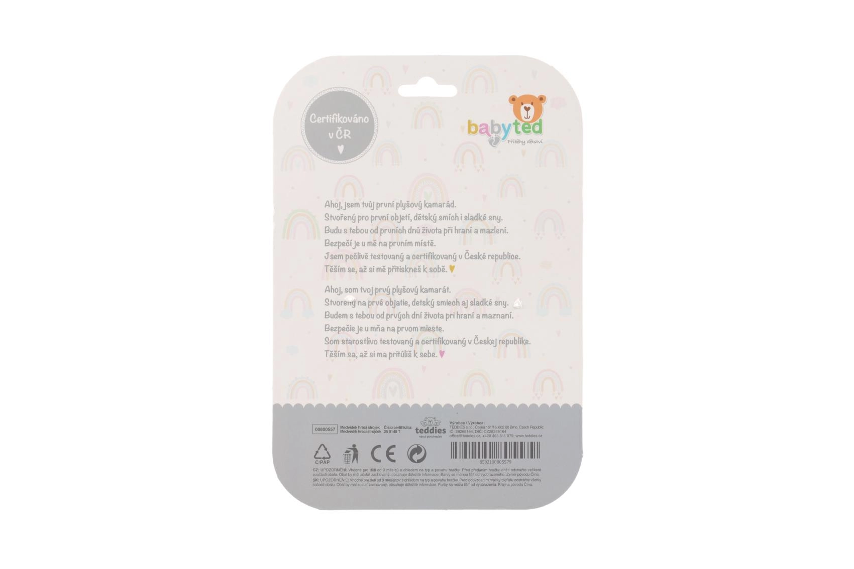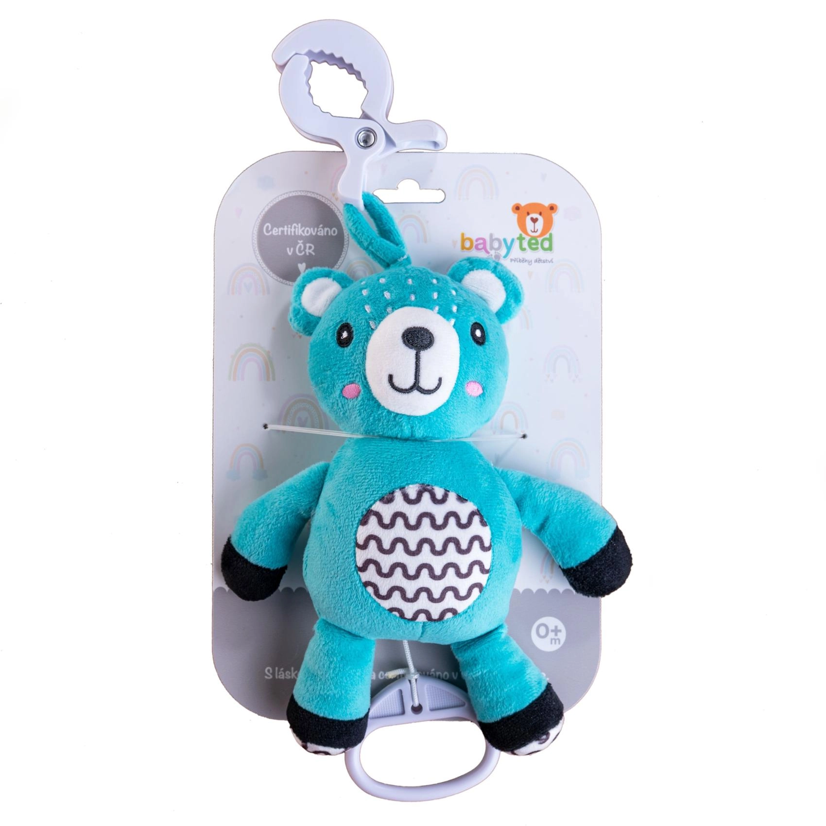 Der superweiche Plüschstoff ist angenehm zu greifen und ideal für erste Tast-Erfahrungen, während kontrastreiche Muster am Bauch die visuelle Wahrnehmung fördern. Das Spielzeug ist in der Tschechischen Republik zertifiziert und für Kinder ab Geburt (0m+) geeignet.
