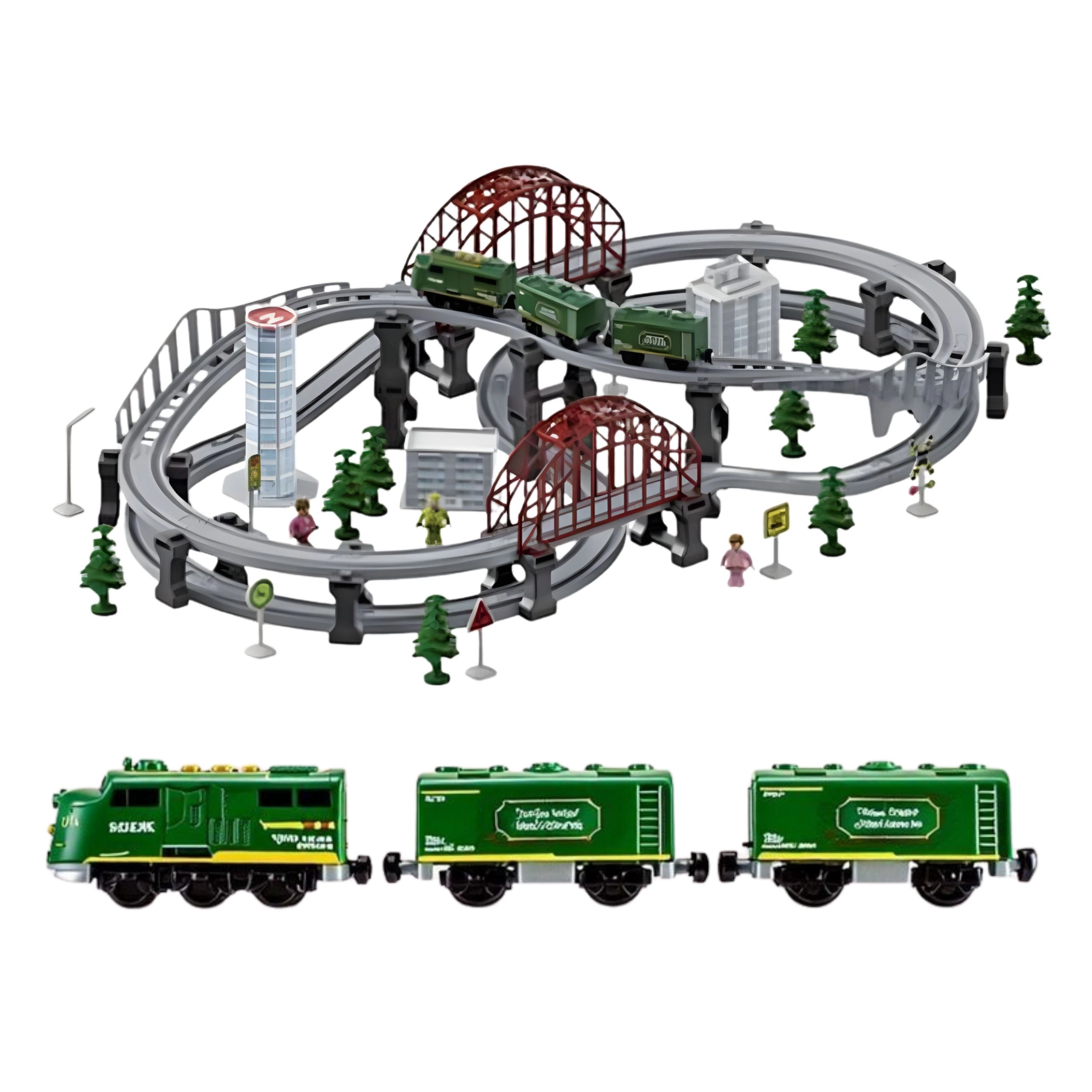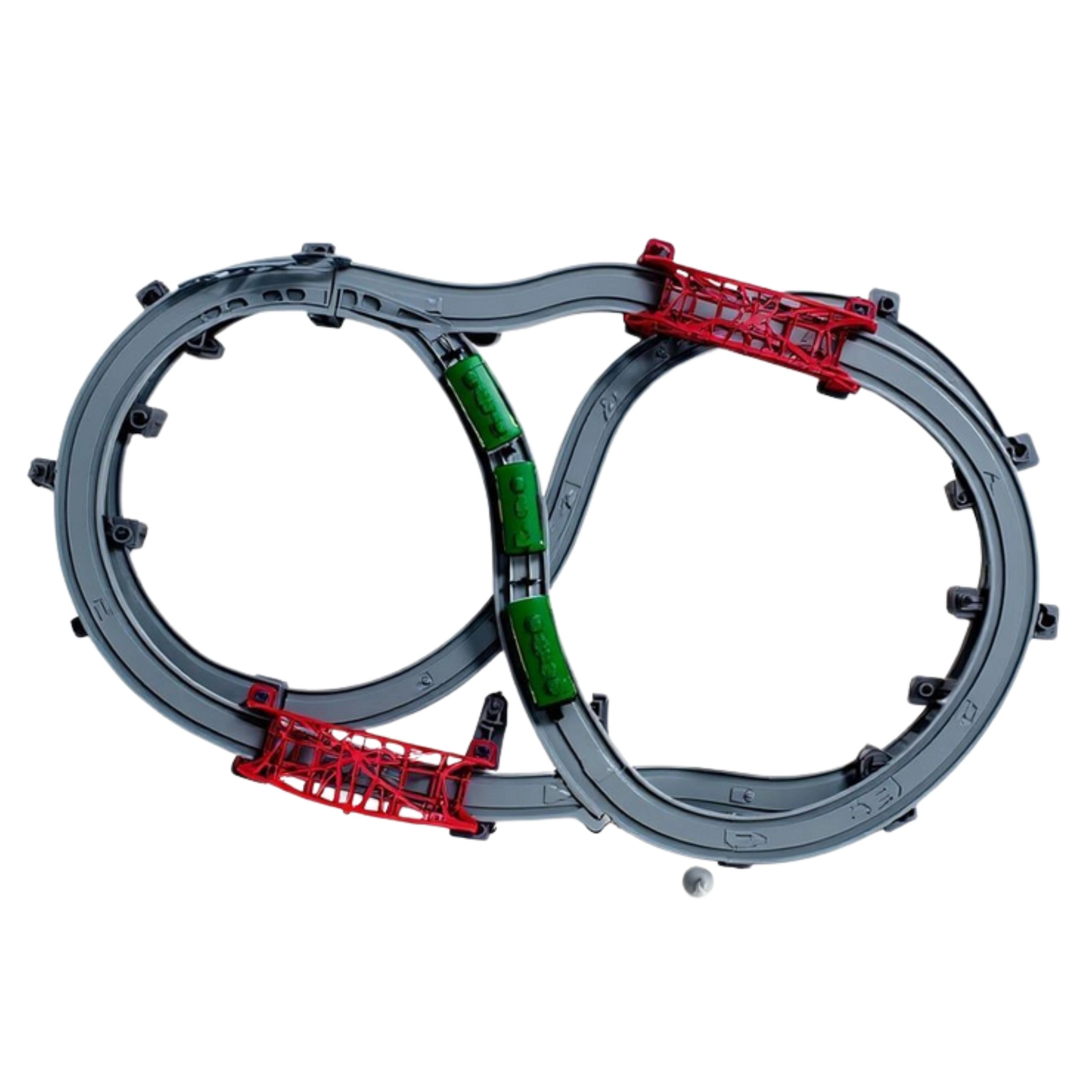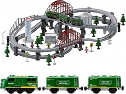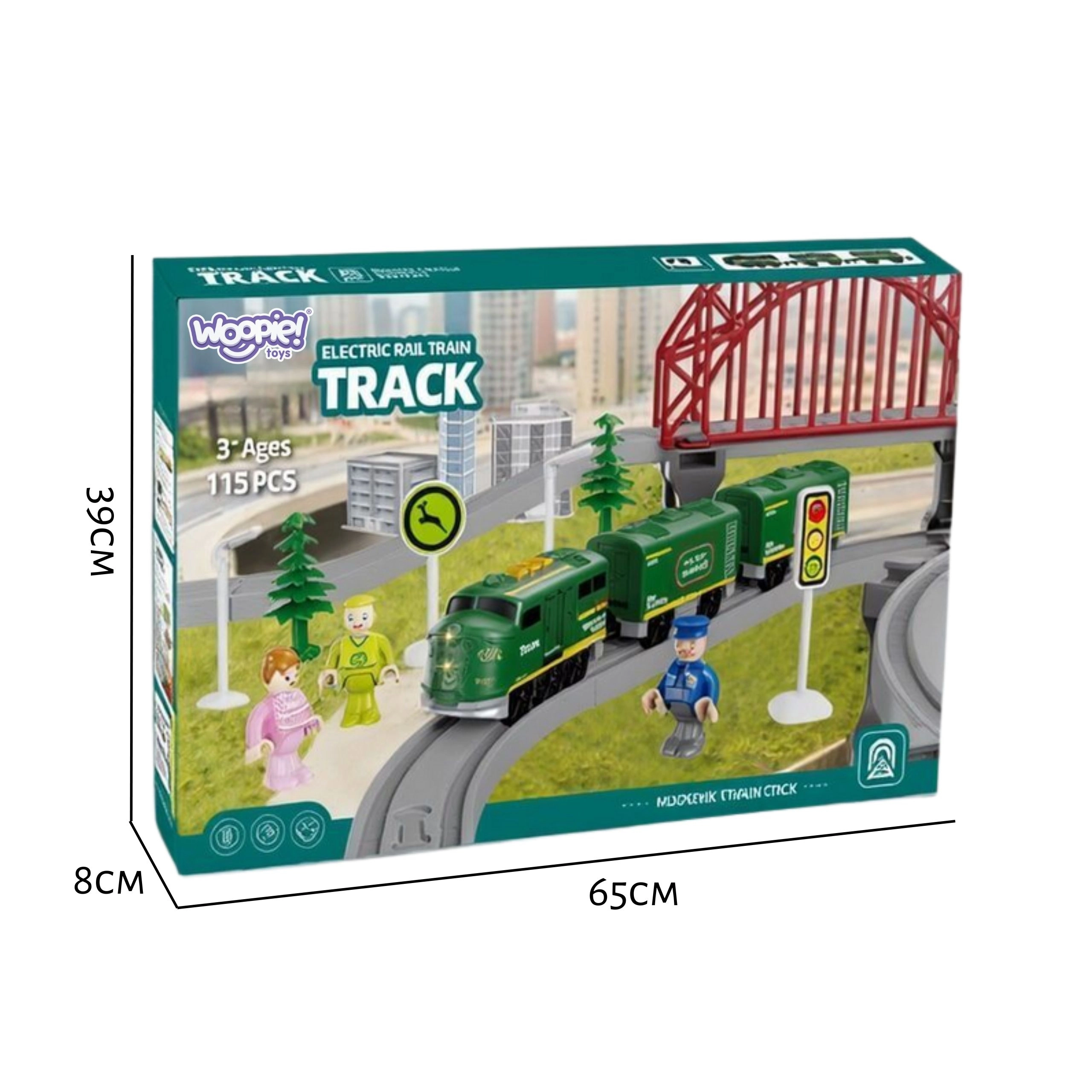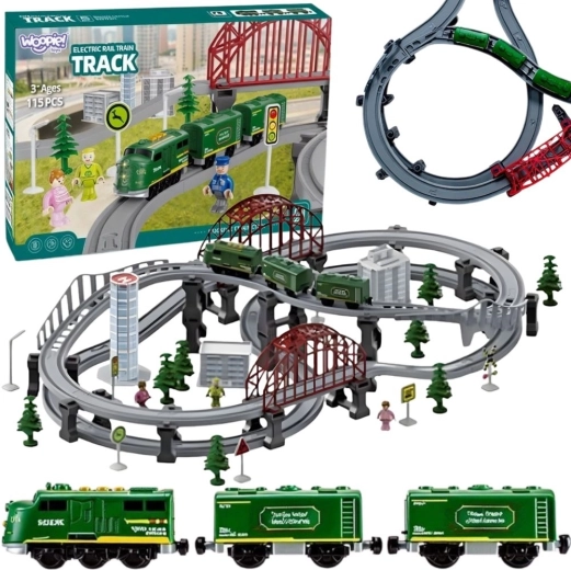 Die große Woopie-Eisenbahnstrecke bringt realistische Eisenbahnatmosphäre ins Kinderzimmer. Die batteriebetriebene Lokomotive fährt sanft vorwärts und rückwärts, begleitet von realistischen Zuggeräuschen und leuchtenden Scheinwerfern. Mit den variablen Teilen lassen sich einfache Rundkurse ebenso bauen wie komplexe Netzwerke mit Brücken, Viadukten und Weichen.