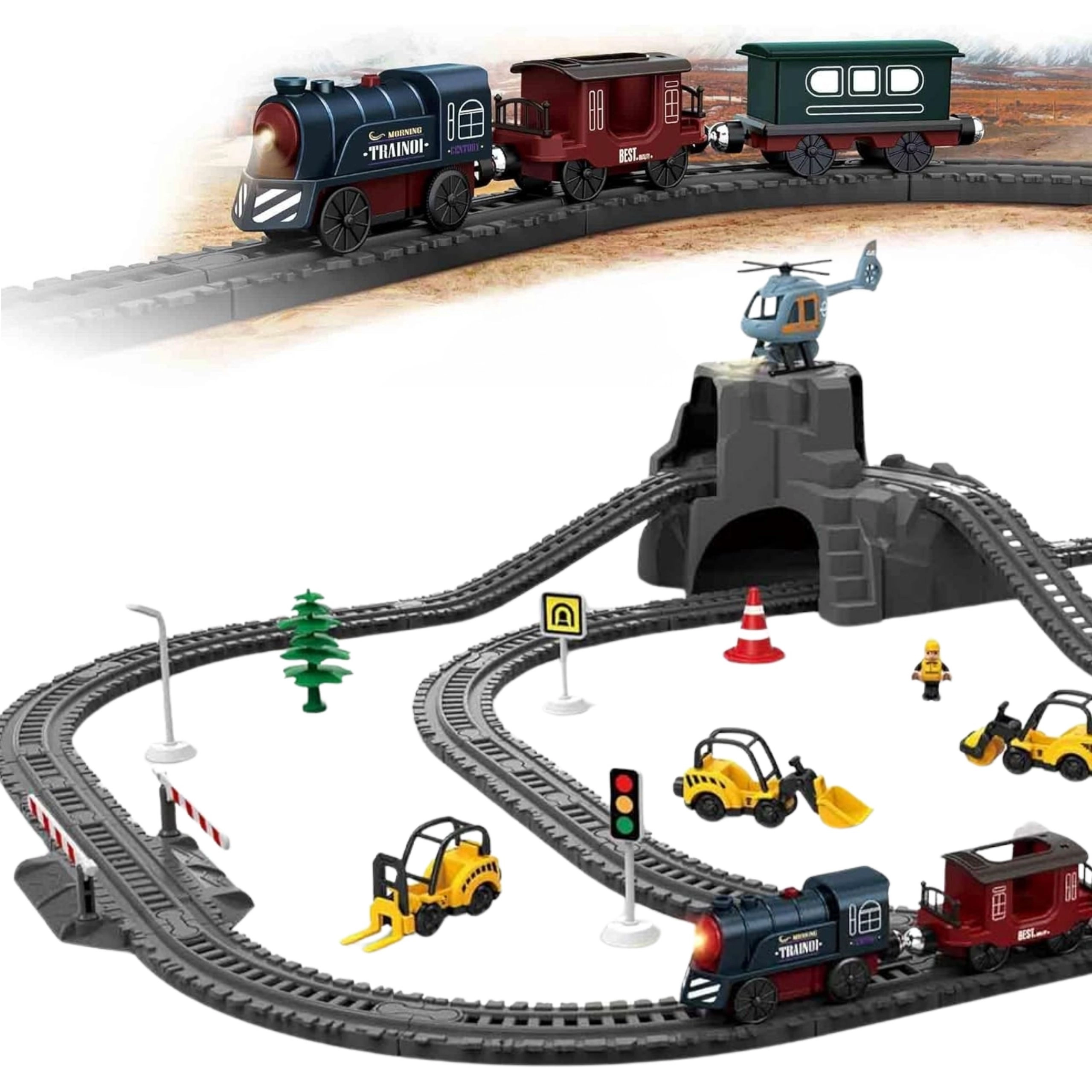 Ein Tunnelhügel, Verkehrsschilder, Schranken, Bäume, Figuren und Baufahrzeuge verleihen dem Spiel Spannung und die Atmosphäre einer echten Eisenbahn.