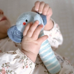 Transparente „Regen“-Rasseln mit Kügelchen bieten einen beruhigenden Klang und visuellen Effekt, während leichte, weiche Würfel mit Glöckchen die Feinmotorik und eine sichere Handhabung fördern.