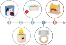 Dieses durchdachte Set nach der Montessori-Methode bietet alles, was ein Kind in der ersten Phase der Weltentdeckung braucht. Die Spielzeuge stimulieren sanft Sehen, Tasten und Hören, führen natürlich zu logischem Denken und stärken die Feinmotorik sowie die Hand-Auge-Koordination. Der praktische Elternratgeber erklärt, wann und wie jedes Spielzeug eingesetzt wird.