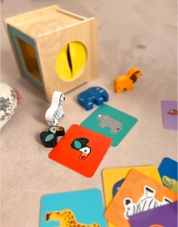 Kinder üben Farben, Formen und das Erkennen von Tieren mit Holzteilen und Karten. Das Spiel unterstützt Logik, Konzentration und die Hand-Auge-Koordination.