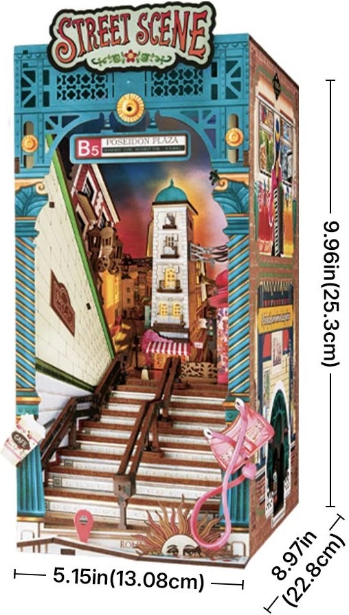 Dieses DIY-Set aus der ROLIFE Book Nook-Reihe verwandelt Ihr Bücherregal in eine malerische Stadtgasse. Der obere Teil der Szene bietet einen Blick auf Straßenniveau – Lampen, Schilder, Pflastersteine und leuchtende Fenster fehlen nicht. Unten an der Treppe entdecken Sie kleine Requisiten des Stadtlebens wie einen Papp-Kaffeebecher oder eine rosa Handtasche sowie für Reisefans ein Sonnensymbol und einen Karten-Pin. Beim Einschieben ins Regal überrascht ein cleveres Element: Unter der Treppe verbirgt sich ein Mini-Bahnhof, der beim Herausziehen sichtbar wird.