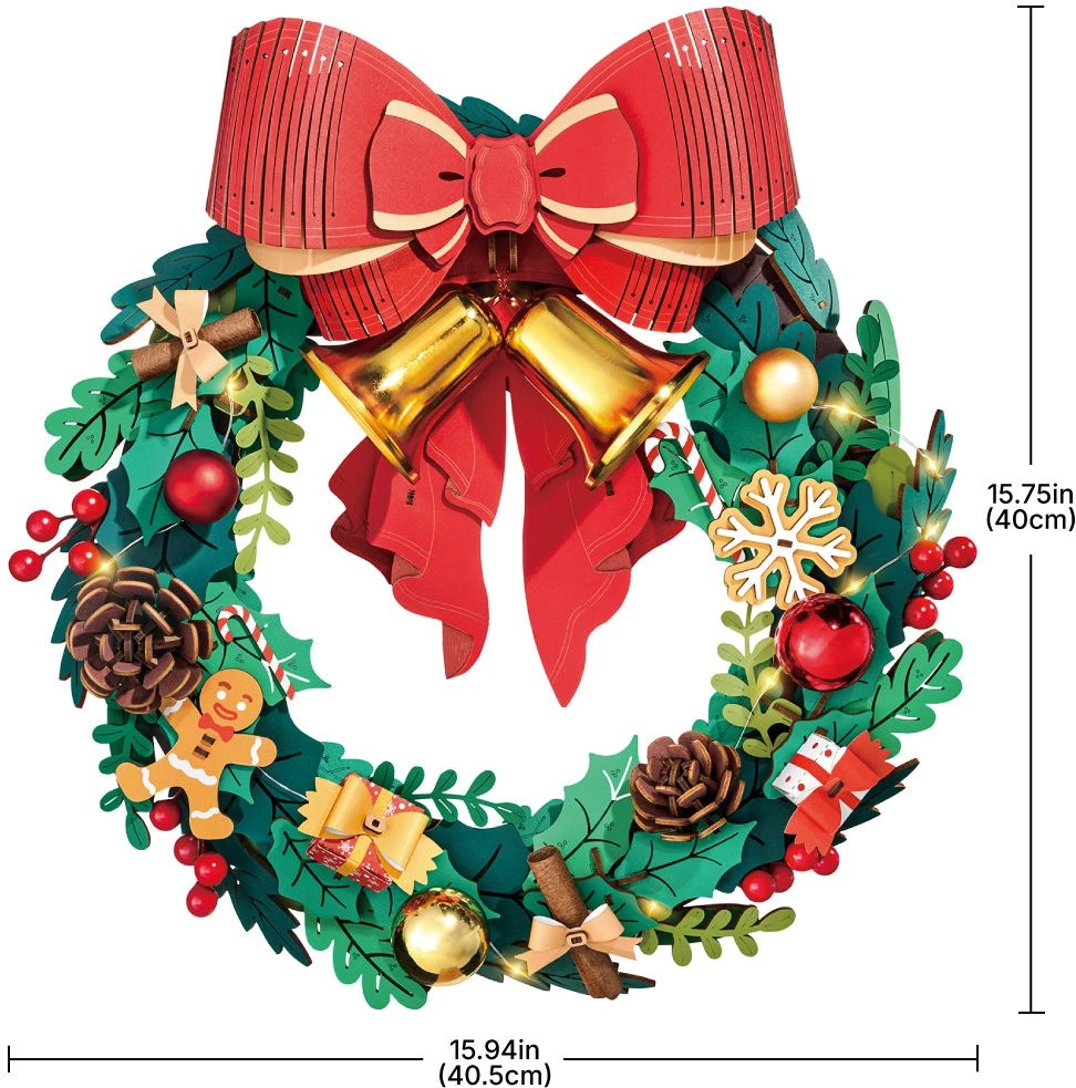 Dieser elegante Weihnachtskranz verbindet traditionelle Motive mit modernem DIY-Spaß. Grüne Zweige werden ergänzt durch Deko wie Stechpalme, Beeren, Zapfen, Schneeflocken, Lebkuchen, Geschenke und die ikonische große rote Schleife mit goldenen Glöckchen. Integrierte LEDs verstärken die festliche Stimmung und verwandeln das fertige Modell in eine einzigartige Dekoration für Tür oder Wand.