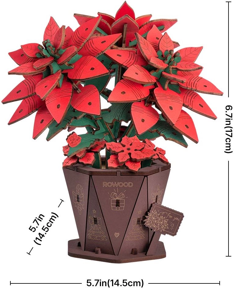 Dieser elegante 3D-Weihnachtsstern im Blumentopf besteht aus lasergeschnittenen, nummerierten Teilen für eine schnelle und intuitive Montage. Dank der robusten Konstruktion behält das Modell seine Form und wird nach dem Zusammenbau zu einer eindrucksvollen Festtagsdeko mit realistischen Blättern und Blütenblättern.