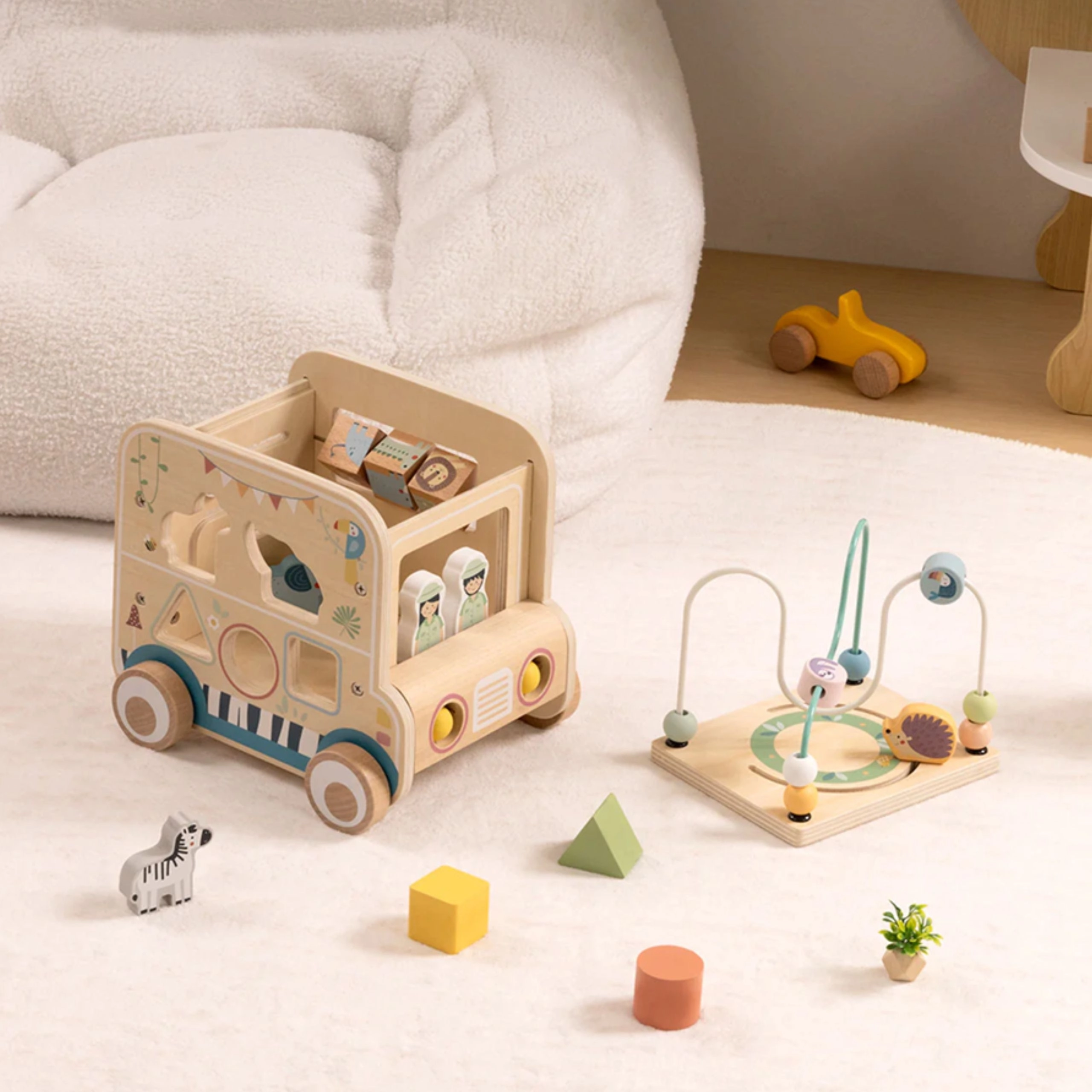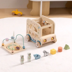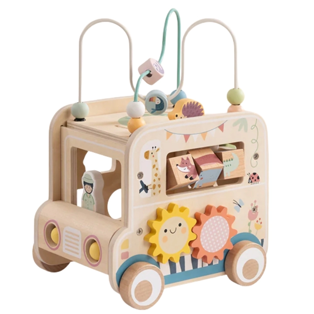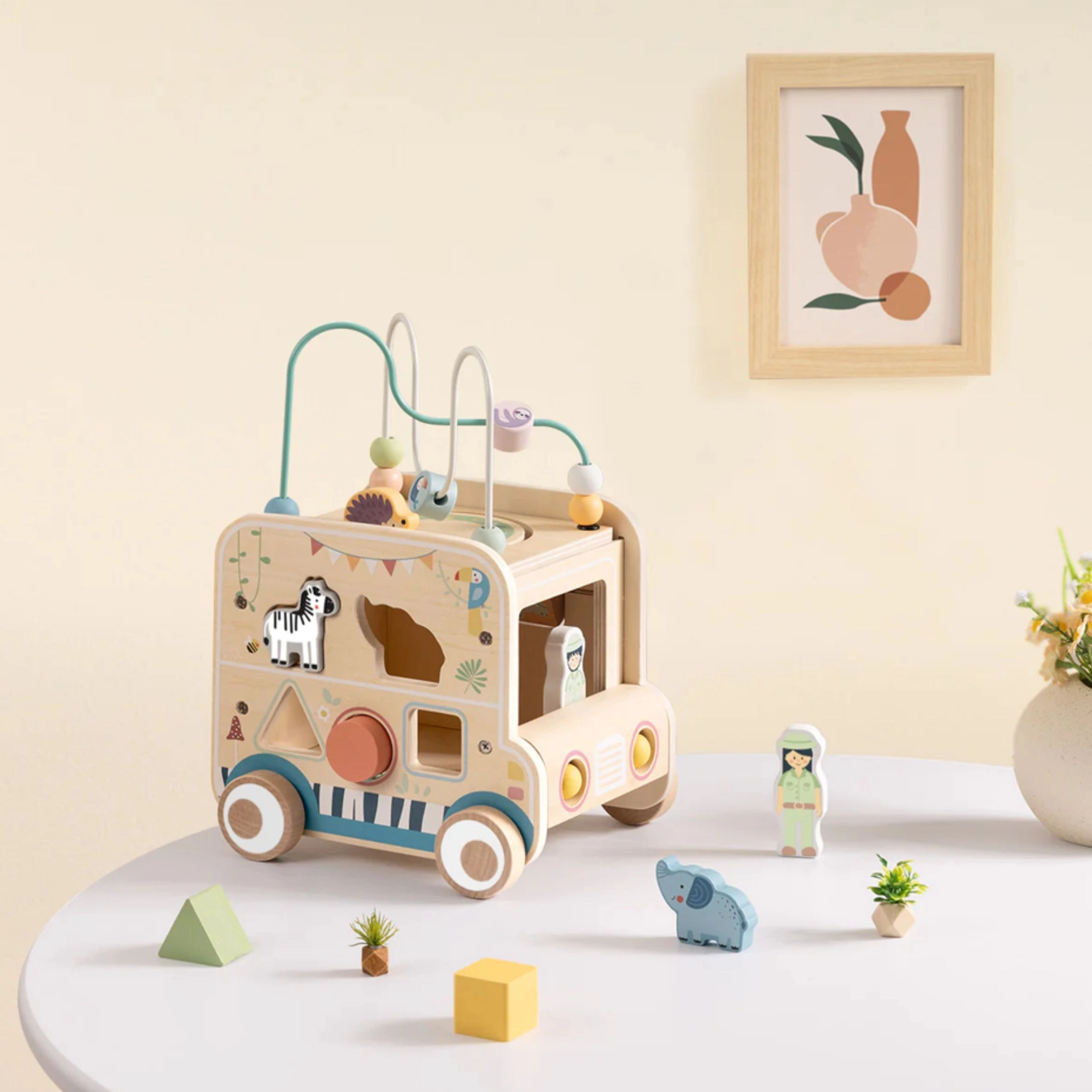 Der Holz-Aktivwürfel/Safari-Auto bietet Kindern unzählige Entdeckungsmöglichkeiten. Vom abnehmbaren Motorik-Bügel mit Perlen über Labyrinth und Zahnräder bis zu drehbaren Blöcken mit Tieren – jede Seite bietet eine neue Herausforderung. Das Design in sanften Farben und die glatte Verarbeitung sorgen für sicheres Spielen und die Förderung wichtiger Fähigkeiten.
