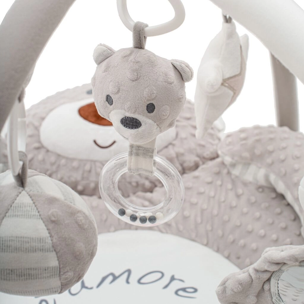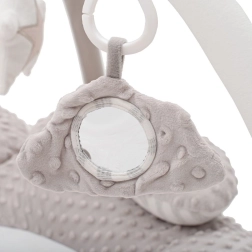 Spiegel, Raschelelemente, Quietscher, weiches Beißspielzeug, Glöckchen und ein Spielzeug mit Melodie unterstützen die Hand-Auge-Koordination und die Entwicklung der Feinmotorik.