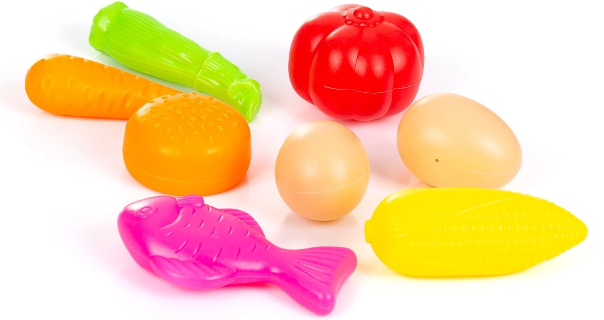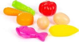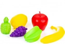 Das Set enthält realistische Obst- und Gemüseattrappen in leuchtenden Farben, die beim Erkennen von Formen helfen und kreatives Rollenspiel fördern.