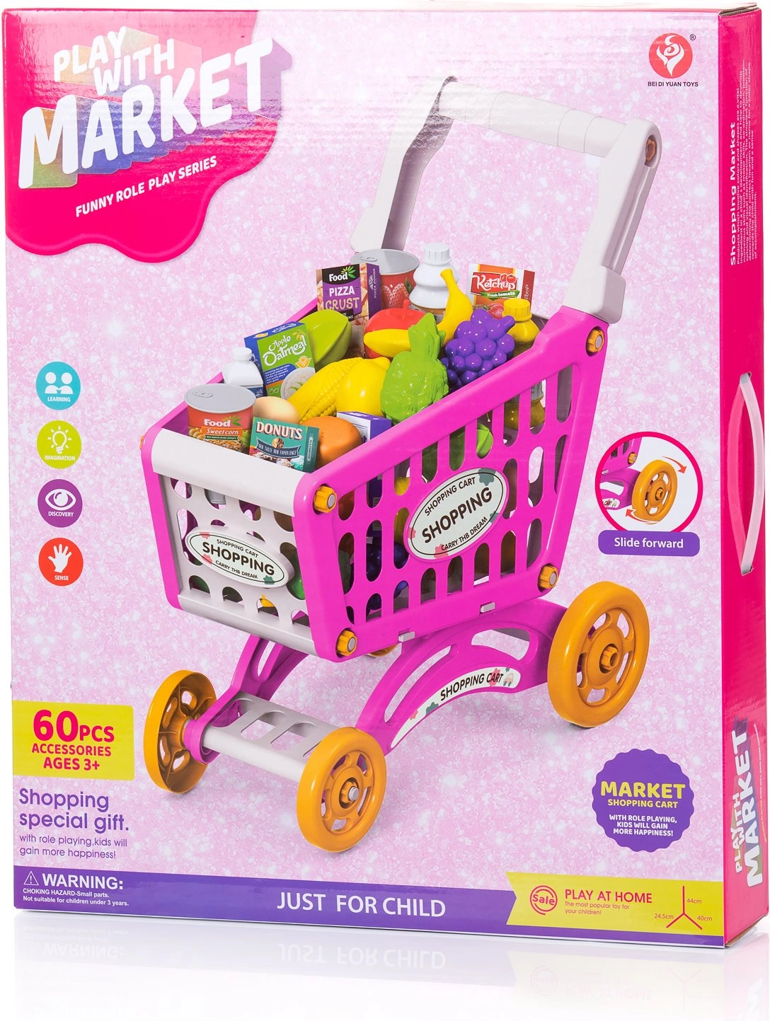 Der Kinder-Einkaufswagen mit Zubehör CHIPOLINO verwandelt jedes Zimmer in einen kleinen Marktplatz. Dank der leichten Konstruktion, des bequemen Griffs und leicht laufender Räder können Kinder realistisch einkaufen und anschließend in der Kinderküche „kochen“. Enthalten sind bunte Lebensmittel-Attrappen, die das Erkennen von Formen, Farben und Lebensmittelarten fördern.