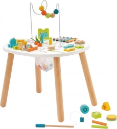 Auf der Tischplatte entdecken Kinder vielfältige Stationen: ein Draht-Perlenlabyrinth, ein Xylophon mit Schlägel, drehbare Zahnräder, ein magnetisches Angelspiel, eine Formen-Einlegeaufgabe und weitere durchdachte Elemente zum Trainieren von Logik, Geduld und Koordination. Dank der vielen Aktivitäten an einem Ort bleibt die Spielecke übersichtlich und Kinder können sich leicht konzentrieren.