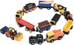 Dieses vielseitige Set erweitert jede Kinder-Spielzeugeisenbahn um eine Lok, Waggons und Arbeitsfahrzeuge. Die Teile lassen sich dank Magnetkupplungen leicht verbinden und rollen sanft über glatte Flächen sowie kompatible Schienen. Realistische Elemente wie das Verladen von Holzstämmen, Kohle oder der Transport von Autos inspirieren zu fantasievollen Rollenspielen.