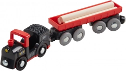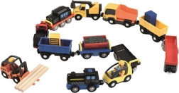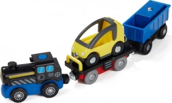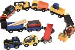 Eine Lok mit Kohle- und Holzstammwagen zieht Kinder in die Welt der Eisenbahn. Das Ab- und Ankoppeln der Waggons fördert die Feinmotorik und das fantasievolle Spiel.