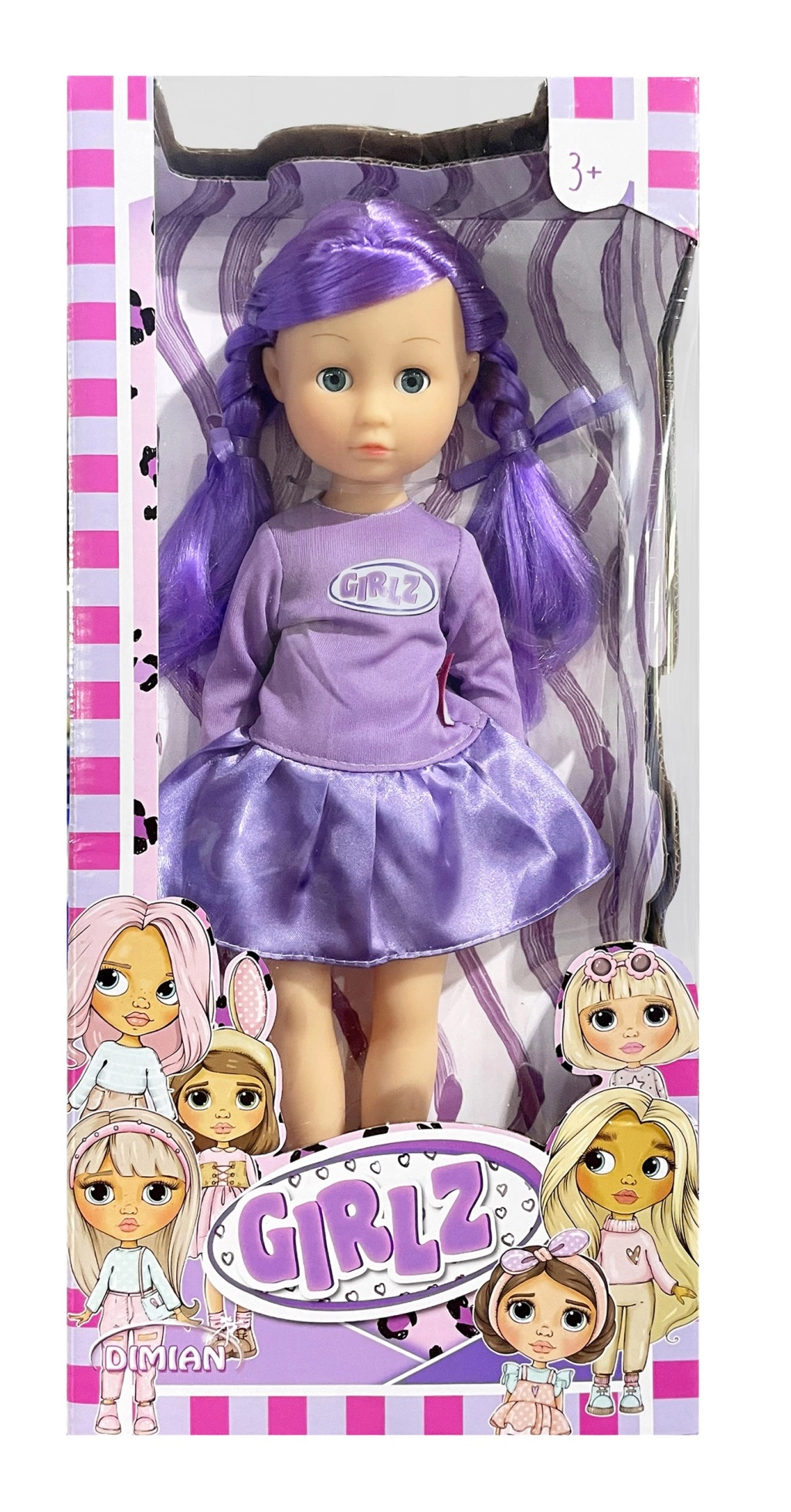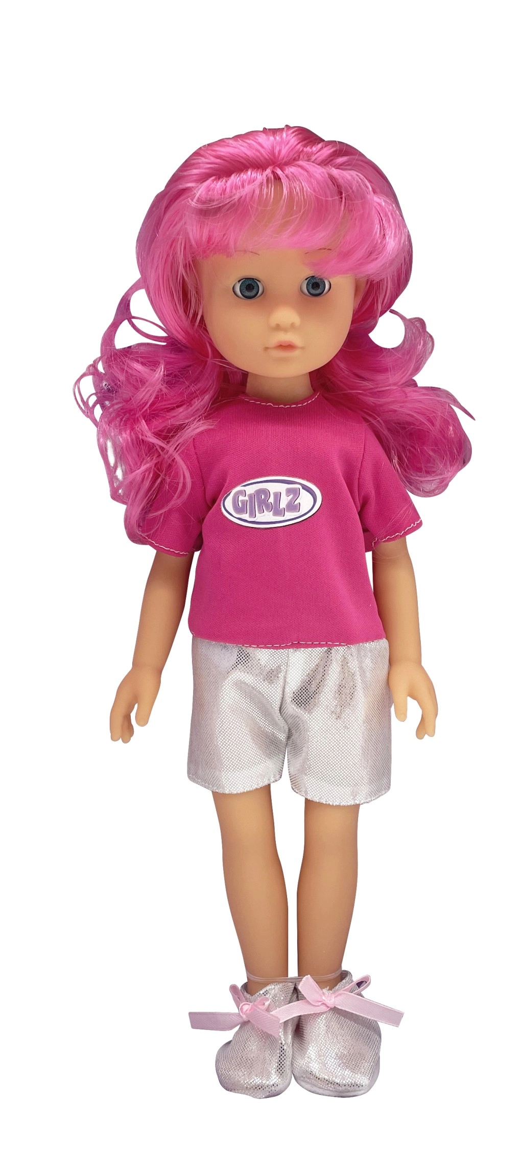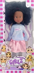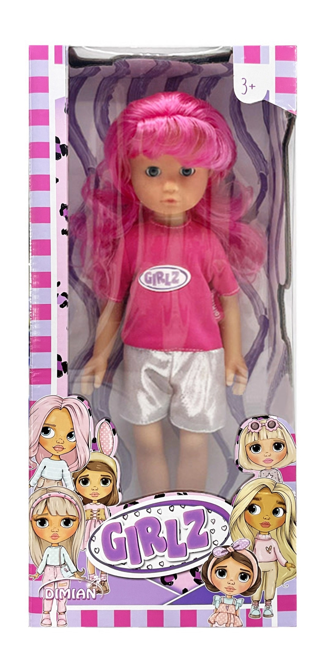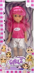 Zur Auswahl stehen vier modische Varianten, die mit Farben und Accessoires beeindrucken: die rosahaarige GIRLZ mit T-Shirt und silbernen Shorts, die blonde GRLZ mit rosafarbenem Top und gelbem Rock, die violetthaarige Variante mit glitzerndem Rock und eleganten Schuhen sowie eine Puppe mit dunkler Haut und lockigem Haar in Kombination aus hellblauem Top und rosafarbenem Rock.