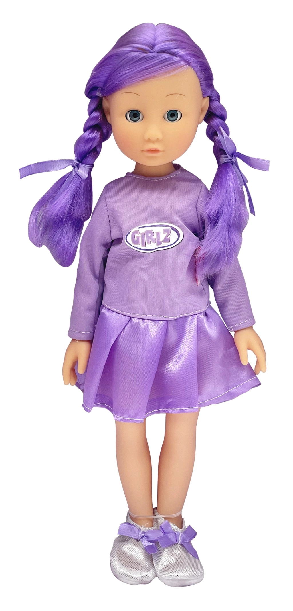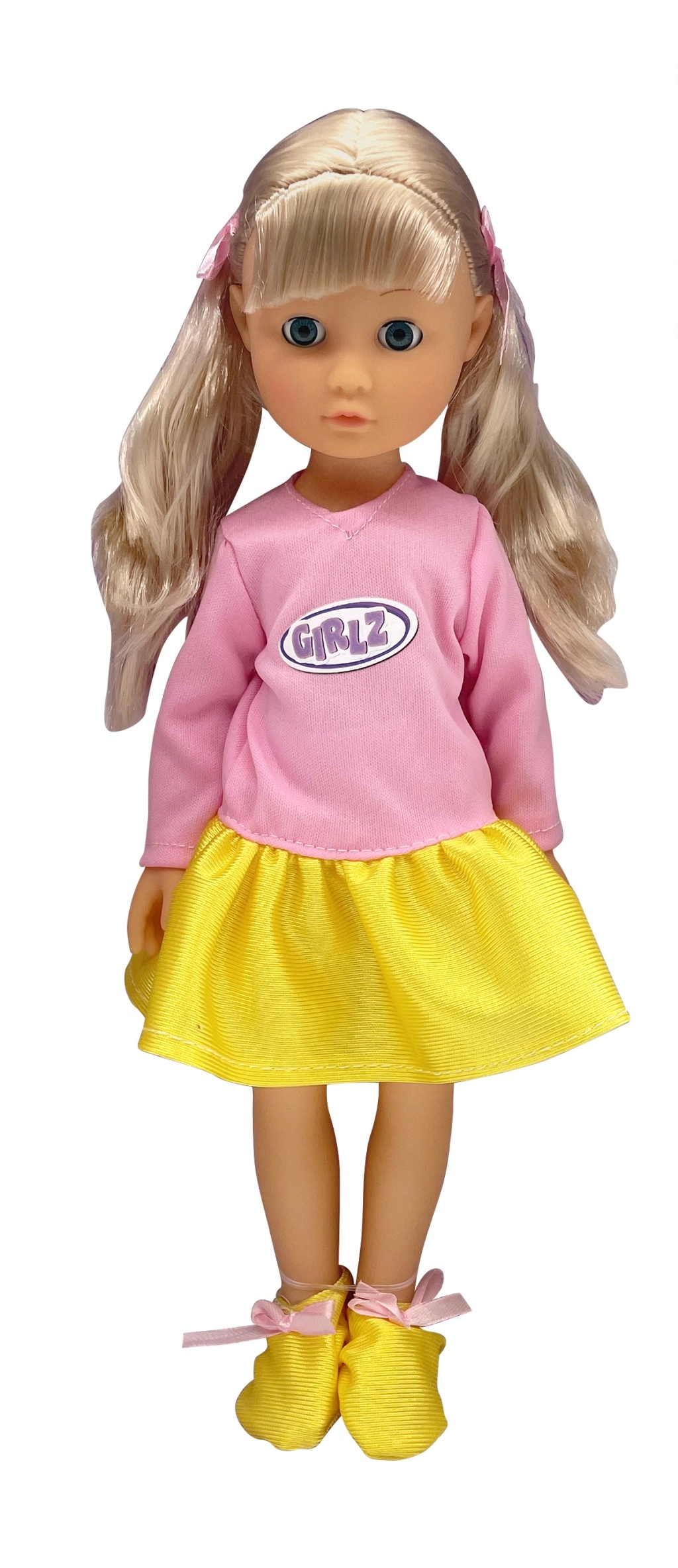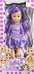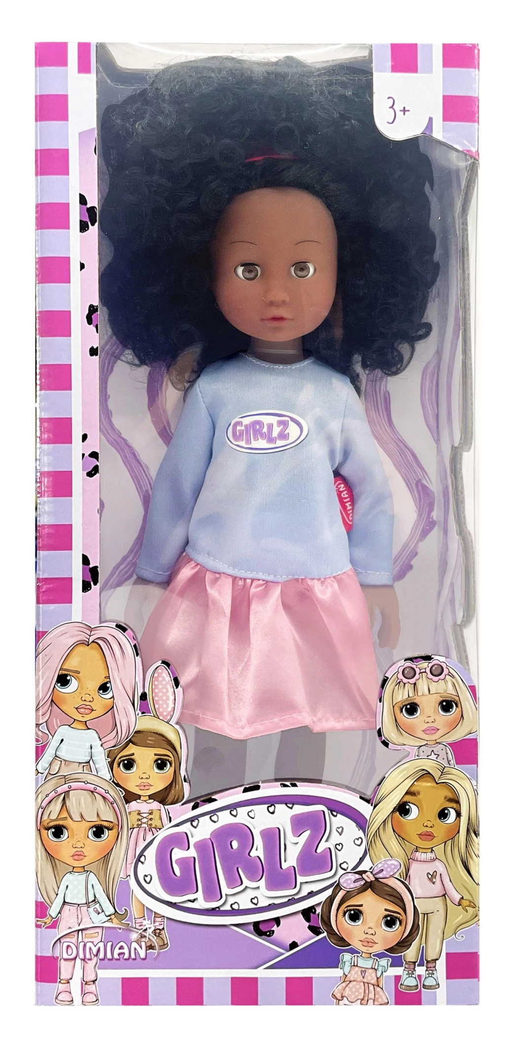 Zur Auswahl stehen vier modische Varianten, die mit Farben und Accessoires beeindrucken: die rosahaarige GIRLZ mit T-Shirt und silbernen Shorts, die blonde GRLZ mit rosafarbenem Top und gelbem Rock, die violetthaarige Variante mit glitzerndem Rock und eleganten Schuhen sowie eine Puppe mit dunkler Haut und lockigem Haar in Kombination aus hellblauem Top und rosafarbenem Rock.