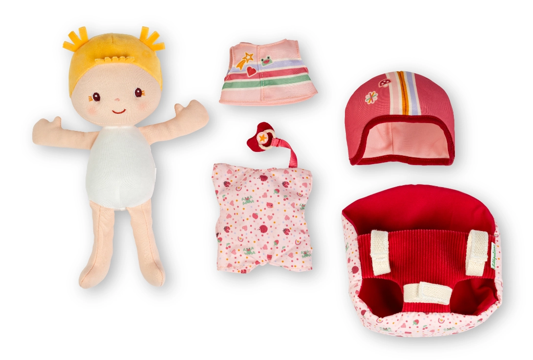 Die Stoffpuppe Lena ist die perfekte Begleiterin für Ausflüge. Dank des weichen Textilkörpers eignet sie sich wunderbar zum Kuscheln und regt Rollenspiele an – Kinder können die Puppe dem Kind zugewandt in den Sitz setzen und während der Fahrt „für sie sorgen“. Der magnetische Schnuller lässt sich leicht anlegen und hält fest, damit er unterwegs nicht verloren geht.