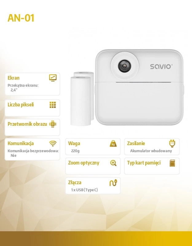 Die Kinderkamera SAVIO AN‑101 kombiniert einfache Bedienung mit umfangreicher Ausstattung für kreativen Spaß. Der Thermodruck ermöglicht das sofortige Ausdrucken schwarzweißer Aufnahmen ohne Tintenkosten. Das Weitwinkelobjektiv mit 90° Sichtfeld und bis zu 48 MP Auflösung liefert scharfe und detailreiche Fotos und Videos.