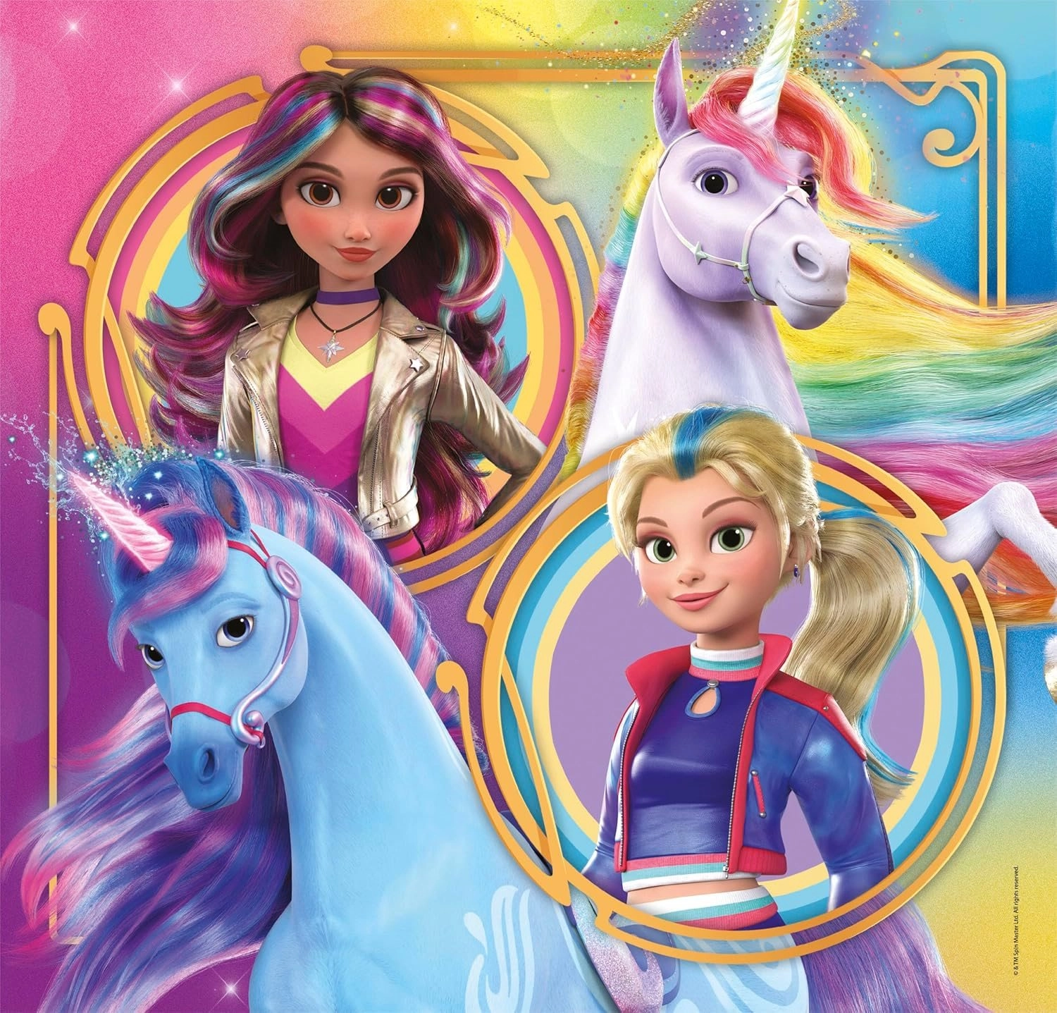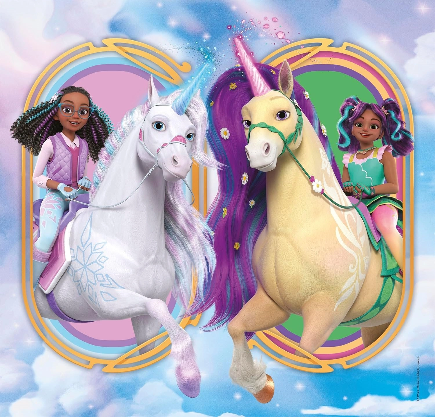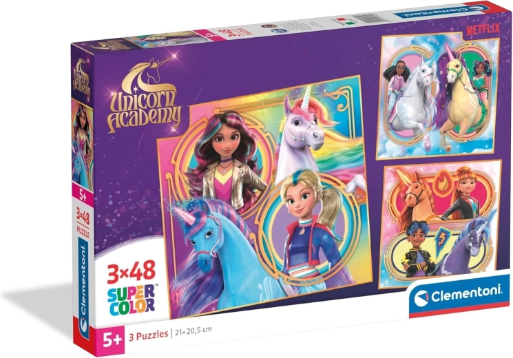 Entdecken Sie die Welt der magischen Einhörner mit einem wunderschönen Set aus drei Puzzles, ideal für Kinder. Jedes Puzzle hat 48 Teile und erreicht im zusammengesetzten Zustand ca. 21 × 20,5 cm. Dank der stabilen Kartonkonstruktion lassen sich die Teile bequem legen und passen gut ineinander.